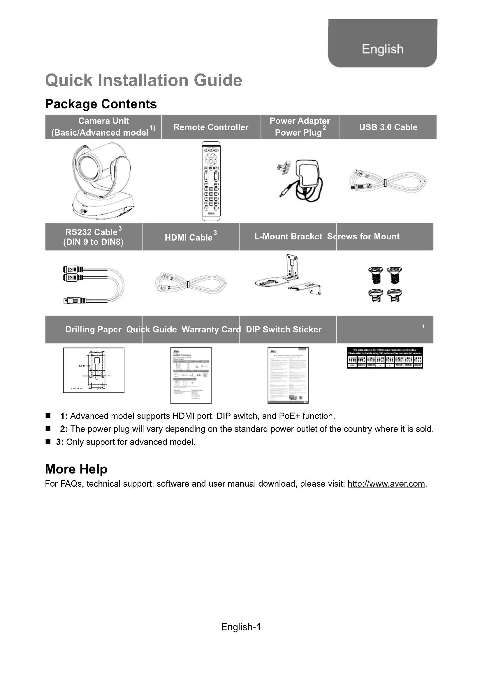 1: Advanced model supports HDMI port, DIP switch, and PoE+ function. 2: The power plug will vary depending on the standard power outlet of the country where it is sold. 3: Only support for advanced model. More Help For FAQs, technical support, software and user manual download, please visit: http://www.aver.com. English-2 Overview