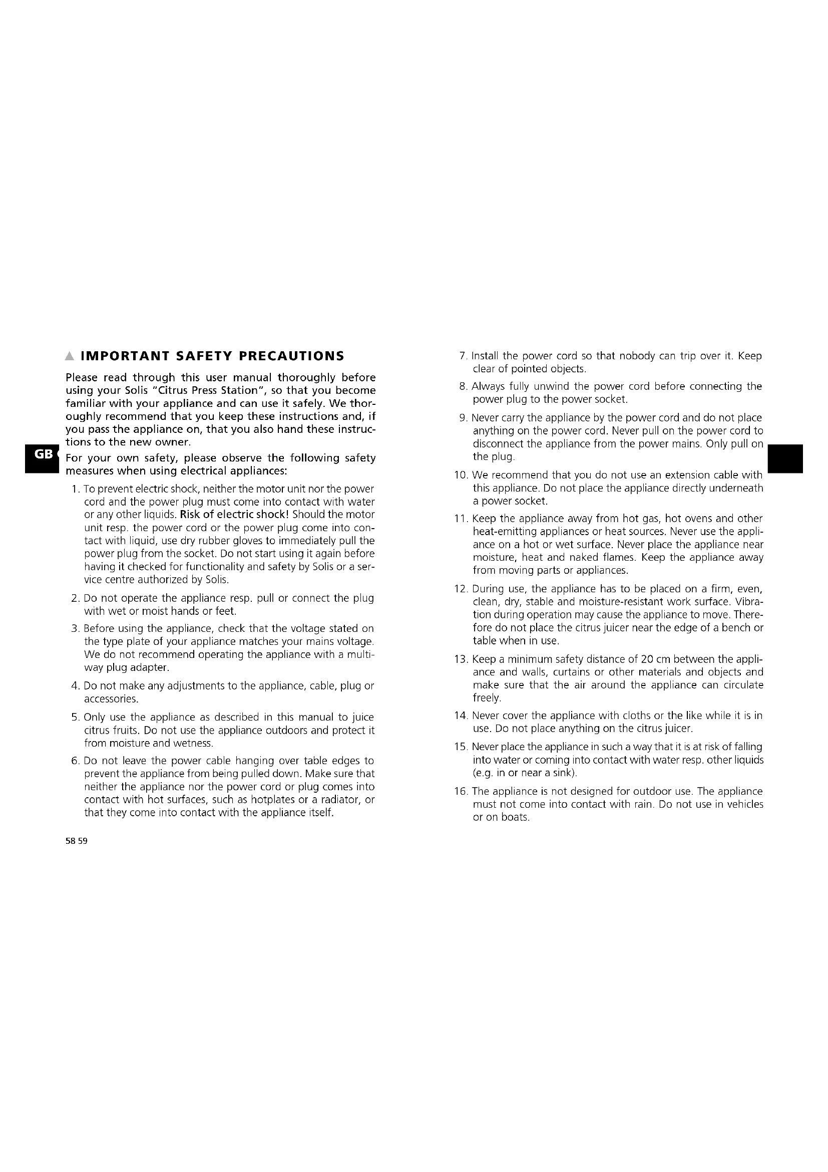 Please read through this user manual thoroughly before using your Solis “Citrus Press Station”, so that you become familiar with your appliance and can use it safely. We thor- oughly recommend that you keep these instructions and, if you pass the appliance on, that you also hand these instruc- tions to the new owner. For your own safety, please observe the following safety measures when using electrical appliances: