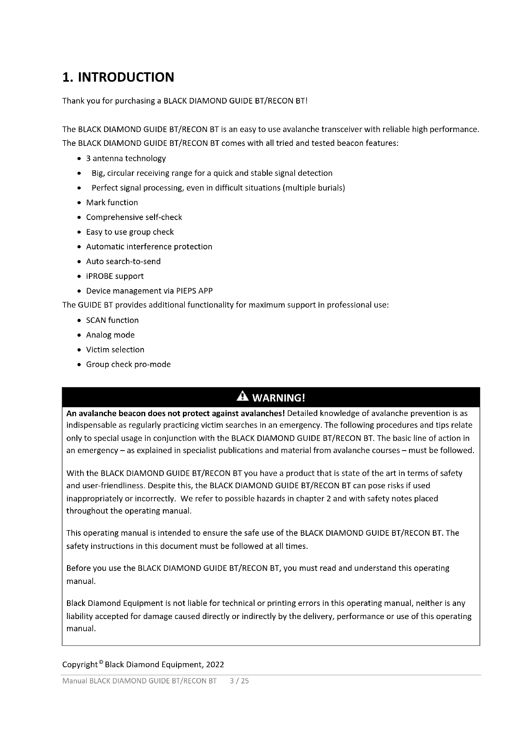- Group check pro-mode WARNING! An avalanche beacon does not protect against avalanches! Detailed knowledge of avalanche prevention is as indispensable as regularly practicing victim searches in an emergency. The following procedures and tips relate only to special usage in conjunction with the BLACK DIAMOND GUIDE BT/RECON BT. The basic line of action in an emergency – as explained in specialist publications and material from avalanche courses – must be followed. With the BLACK DIAMOND GUIDE BT/RECON BT you have a product that is state of the art in terms of safety and user-friendliness. Despite this, the BLACK DIAMOND GUIDE BT/RECON BT can pose risks if used inappropriately or incorrectly. We refer to possible hazards in chapter 2 and with safety notes placed throughout the operating manual. This operating manual is intended to ensure the safe use of the BLACK DIAMOND GUIDE BT/RECON BT. The safety instructions in this document must be followed at all times. Before you use the BLACK DIAMOND GUIDE BT/RECON BT, you must read and understand this operating manual. Black Diamond Equipment is not liable for technical or printing errors in this operating manual, neither is any liability accepted for damage caused directly or indirectly by the delivery, performance or use of this operating manual.