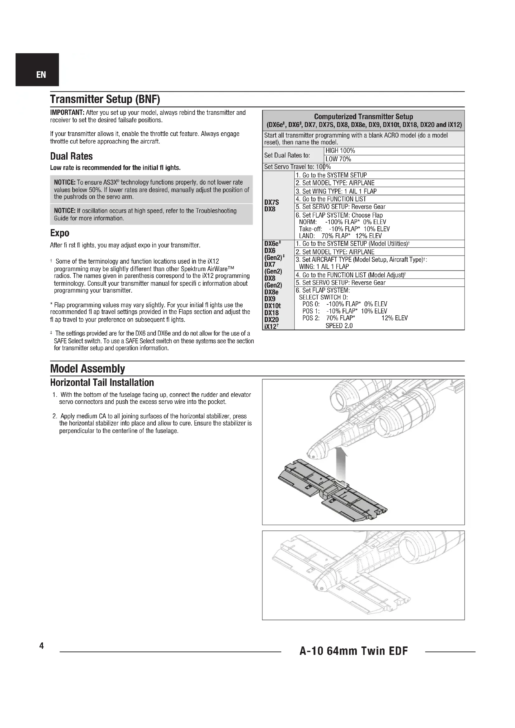 The settings provided are for the DX6 and DX6e and do not allow for the use of a SAFE Select switch. To use a SAFE Select switch on these systems see the section for transmitter setup and operation information. Horizontal Tail Installation