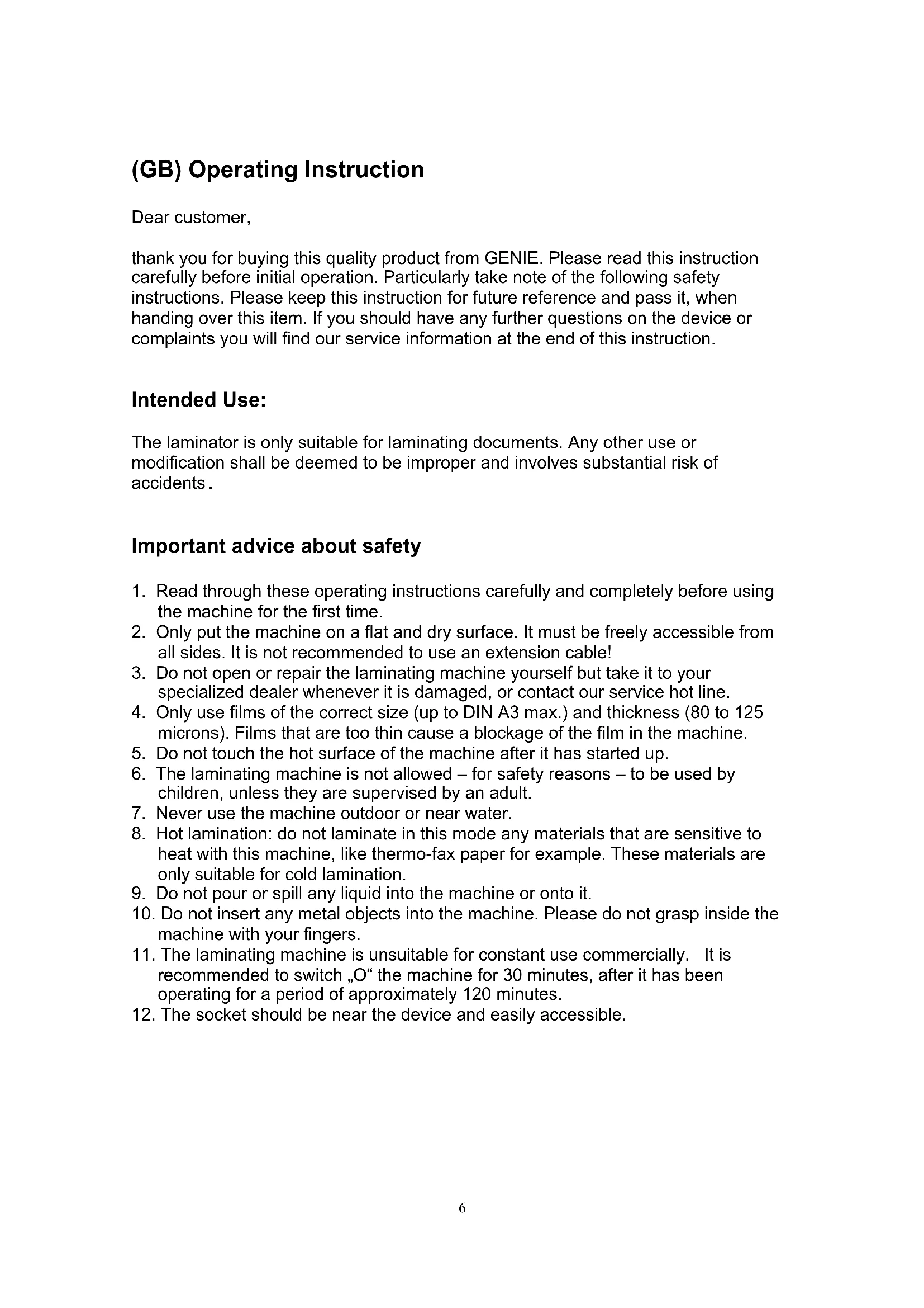 Importeur: GENIE GmbH & Co. KG Berta-Cramer-Ring 22 65205 Wiesbaden, Germany6 (GB) Operating Instruction Dear customer, thank you for buying this quality product from GENIE. Please read this instruction carefully before initial operation. Particularly take note of the following safety instructions. Please keep this instruction for future reference and pass it, when handing over this item. If you should have any further questions on the device or complaints you will find our service information at the end of this instruction.