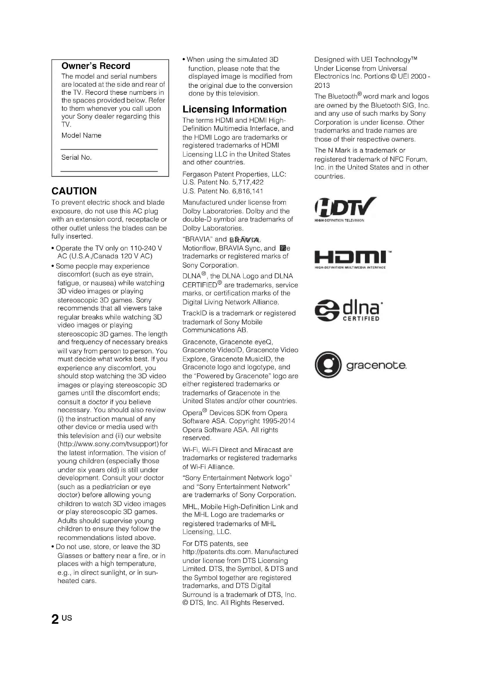 - When using the simulated 3D function, please note that the displayed image is modified from the original due to the conversion done by this television. Licensing Information The terms HDMI and HDMI High- Definition Multimedia Interface, and the HDMI Logo are trademarks or registered trademarks of HDMI Licensing LLC in the United States and other countries. Fergason Patent Properties, LLC: U.S. Patent No. 5,717,422 U.S. Patent No. 6,816,141 Manufactured under license from Dolby Laboratories. Dolby and the double-D symbol are trademarks of Dolby Laboratories. “BRAVIA” and , S-Force, Motionflow, BRAVIA Sync, and are trademarks or registered marks of Sony Corporation. DLNA