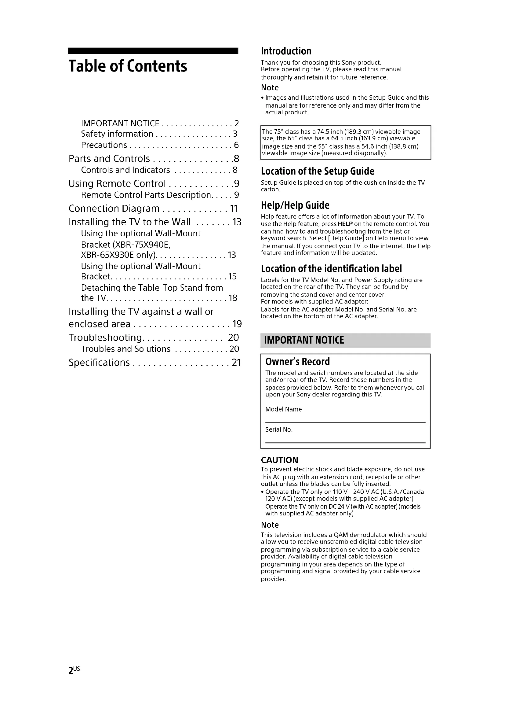 - Images and illustrations used in the Setup Guide and this manual are for reference only and may differ from the actual product. Location of the Setup Guide Setup Guide is placed on top of the cushion inside the TV carton. Help/Help Guide Help feature offers a lot of information about your TV. To use the Help feature, press HELP on the remote control. You can find how to and troubleshooting from the list or keyword search. Select [Help Guide] on Help menu to view the manual. If you connect your TV to the internet, the Help feature and information will be updated. Location of the identification label Labels for the TV Model No. and Power Supply rating are located on the rear of the TV. They can be found by removing the stand cover and center cover.For models with supplied AC adapter:Labels for the AC adapter Model No. and Serial No. are located on the bottom of the AC adapter. CAUTION To prevent electric shock and blade exposure, do not use this AC plug with an extension cord, receptacle or other outlet unless the blades can be fully inserted. • Operate the TV only on 110 V - 240 V AC (U.S.A./Canada 120 V AC) (except models with supplied AC adapter) Operate the TV only on DC 24 V (with AC adapter) (models with supplied AC adapter only) Note This television includes a QAM demodulator which should allow you to receive unscrambled digital cable television programming via subscription service to a cable service provider. Availability of digital cable television programming in your area depends on the type of programming and signal provided by your cable service provider.The 75” class has a 74.5 inch (189.3 cm) viewable image size, the 65” class has a 64.5 inch (163.9 cm) viewable image size and the 55” class has a 54.6 inch (138.8 cm) viewable image size (measured diagonally). IMPORTANT NOTICE Owner’s Record The model and serial numbers are located at the side and/or rear of the TV. Record these numbers in the spaces provided below. Refer to them whenever you call upon your Sony dealer regarding this TV.Model NameSerial No.3