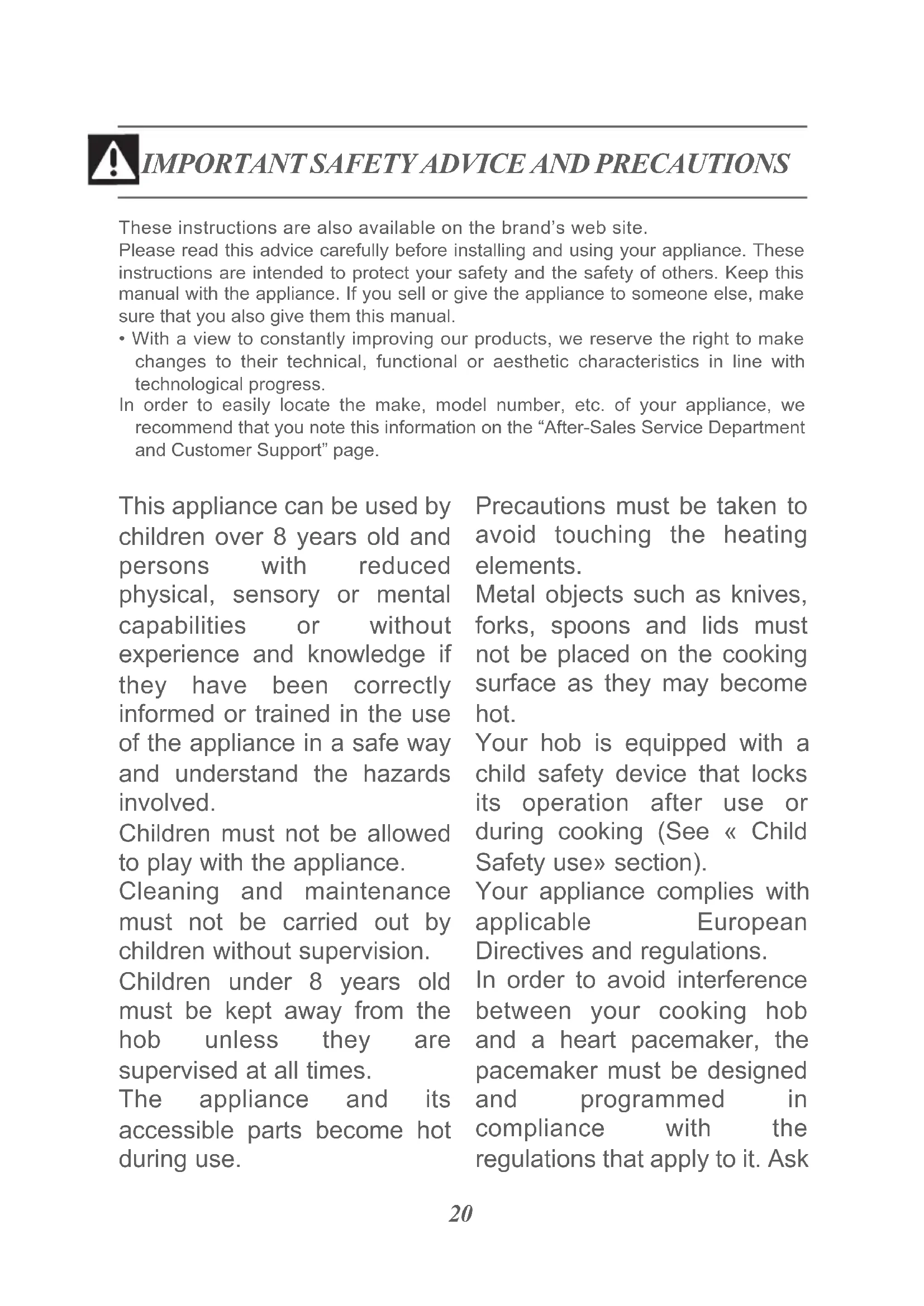 This appliance can be used by children over 8 years old and persons with reduced physical, sensory or mental capabilities or without experience and knowledge if they have been correctly informed or trained in the use of the appliance in a safe way and understand the hazards involved. Children must not be allowed to play with the appliance. Cleaning and maintenance must not be carried out by children without supervision. Children under 8 years old must be kept away from the hob unless they are supervised at all times. The appliance and its accessible parts become hot during use. Precautions must be taken to avoid touching the heating elements. Metal objects such as knives, forks, spoons and lids must not be placed on the cooking surface as they may become hot. Your hob is equipped with a child safety device that locks its operation after use or during cooking (See « Child Safety use» section). Your appliance complies with applicable European Directives and regulations. In order to avoid interference between your cooking hob and a heart pacemaker, the pacemaker must be designed and programmed in compliance with the regulations that apply to it. AskIMPORTANT SAFETY ADVICE AND PRECAUTIONS