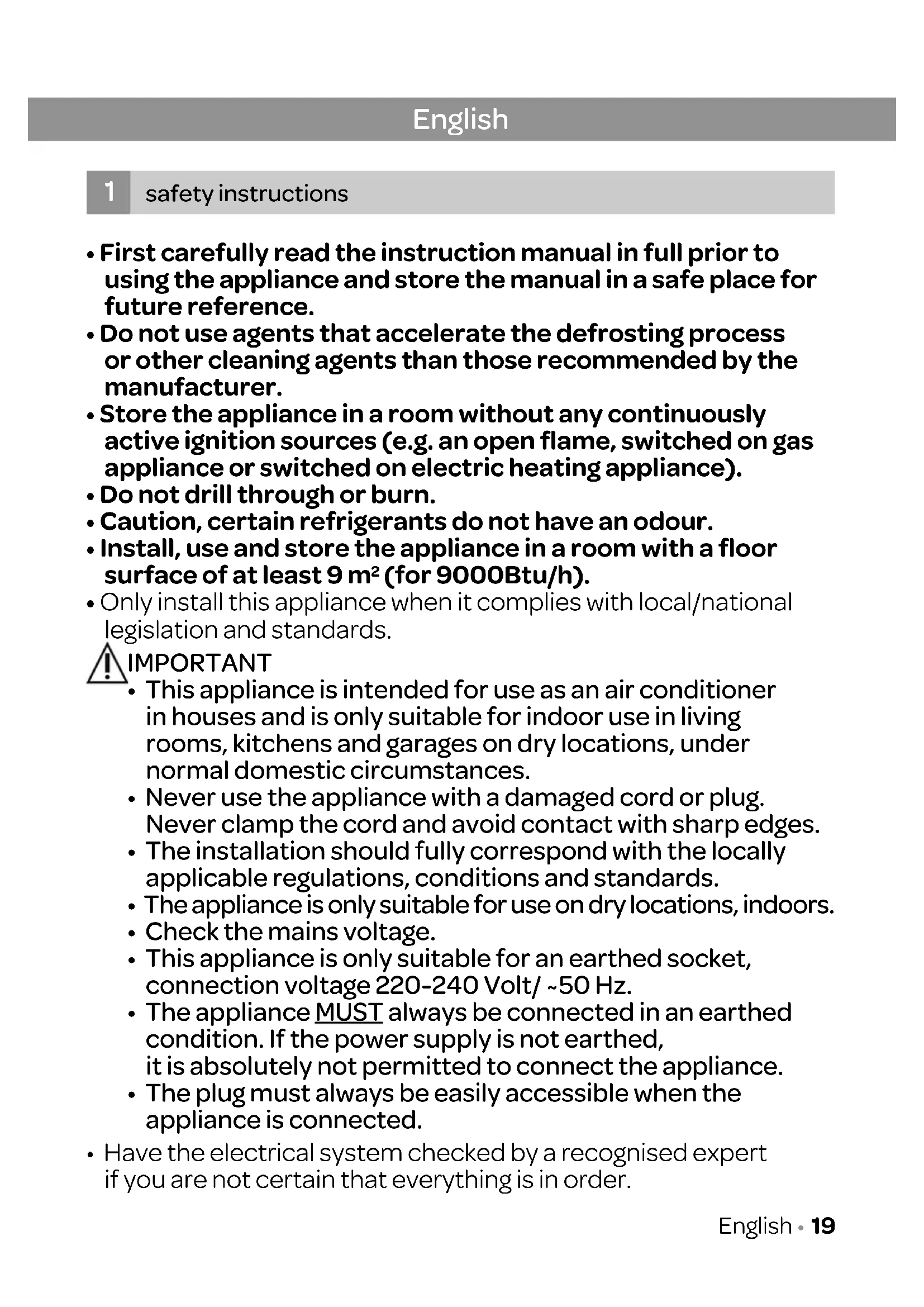 - Install, use and store the appliance in a room with a floor surface of at least 9 m