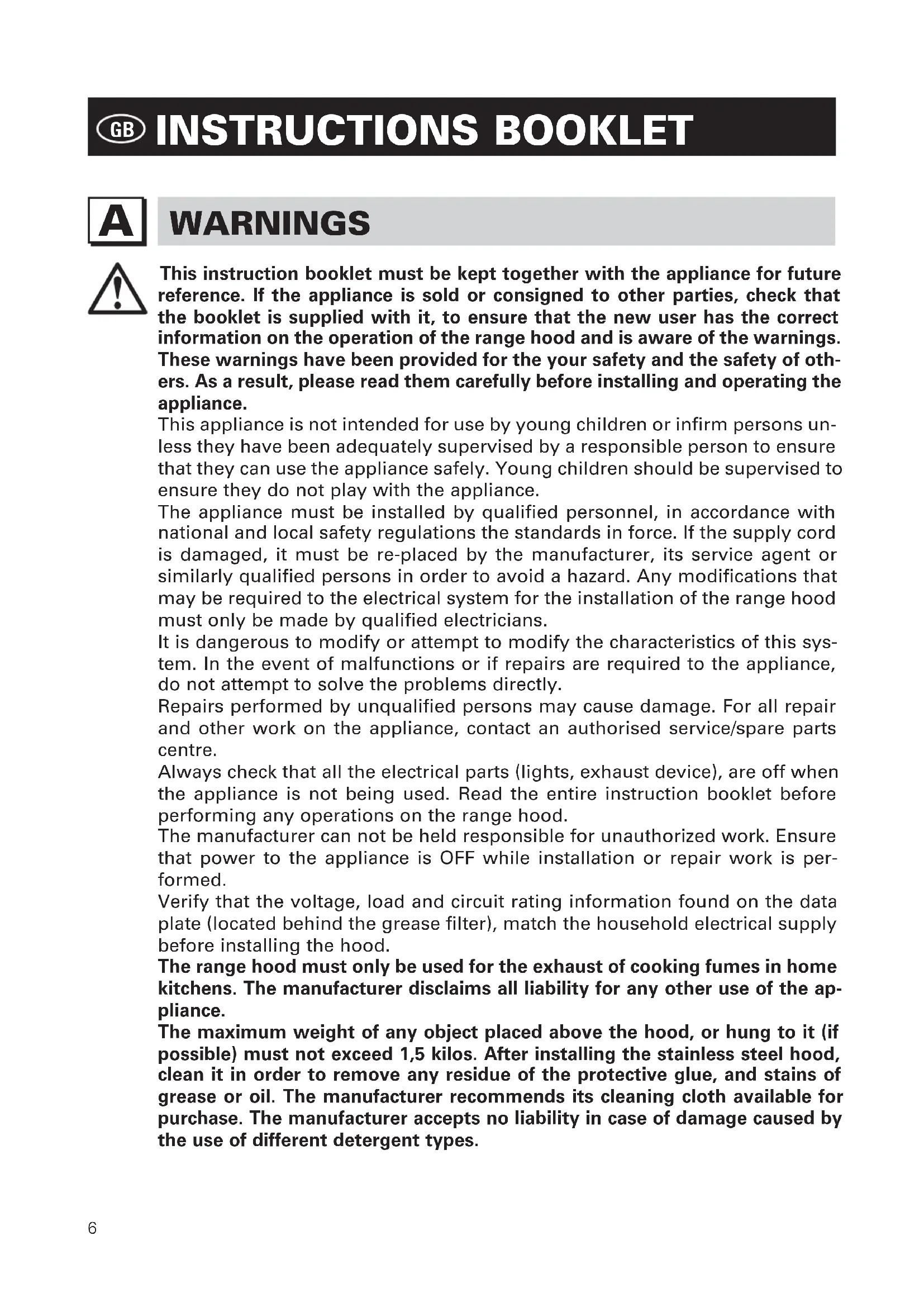 This instruction booklet must be kept together with the appliance for future reference. If the appliance is sold or consigned to other parties, check that the booklet is supplied with it, to ensure that the new user has the correct information on the operation of the range hood and is aware of the warnings. These warnings have been provided for the your safety and the safety of oth- ers. As a result, please read them carefully before installing and operating the appliance. This appliance is not intended for use by young children or infirm persons un- less they have been adequately supervised by a responsible person to ensure that they can use the appliance safely. Young children should be supervised to ensure they do not play with the appliance. The appliance must be installed by qualified personnel, in accordance with national and local safety regulations the standards in force. If the supply cord is damaged, it must be re-placed by the manufacturer, its service agent or similarly qualified persons in order to avoid a hazard. Any modifications that may be required to the electrical system for the installation of the range hood must only be made by qualified electricians. It is dangerous to modify or attempt to modify the characteristics of this sys- tem. In the event of malfunctions or if repairs are required to the appliance, do not attempt to solve the problems directly. Repairs performed by unqualified persons may cause damage. For all repair and other work on the appliance, contact an authorised service/spare parts centre. Always check that all the electrical parts (lights, exhaust device), are off when the appliance is not being used. Read the entire instruction booklet before performing any operations on the range hood. The manufacturer can not be held responsible for unauthorized work. Ensure that power to the appliance is OFF while installation or repair work is per- formed. Verify that the voltage, load and circuit rating information found on the data plate (located behind the grease filter), match the household electrical supply before installing the hood. The range hood must only be used for the exhaust of cooking fumes in home kitchens. The manufacturer disclaims all liability for any other use of the ap- pliance. The maximum weight of any object placed above the hood, or hung to it (if possible) must not exceed 1,5 kilos. After installing the stainless steel hood, clean it in order to remove any residue of the protective glue, and stains of grease or oil. The manufacturer recommends its cleaning cloth available for purchase. The manufacturer accepts no liability in case of damage caused by the use of different detergent types.7 TECHNICAL SPECIFICATIONS