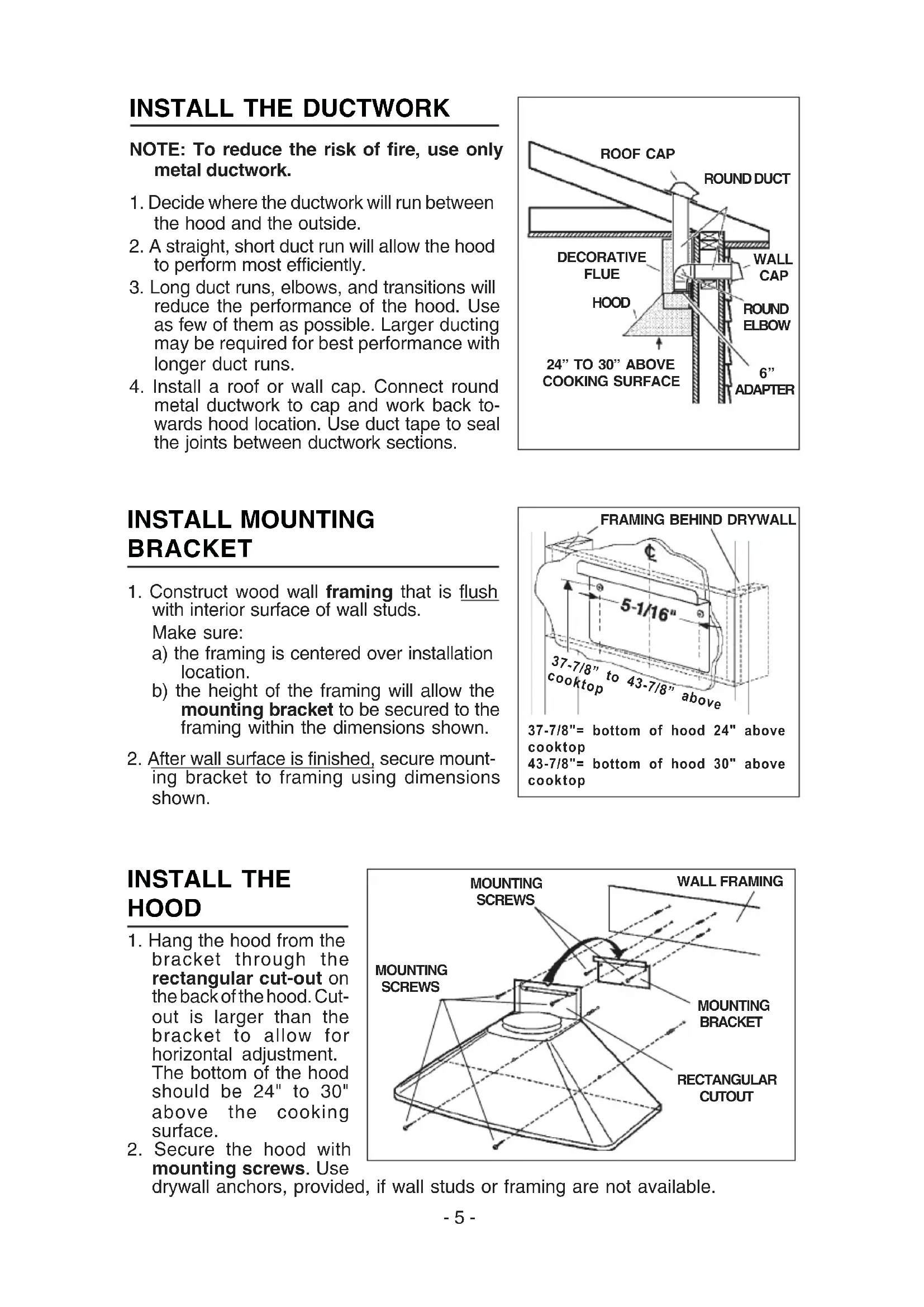 metal ductwork to cap and work back to- wards hood location. Use duct tape to seal the joints between ductwork sections. MOUNTING SCREWS RECTANGULAR CUTOUT WALL FRAMING MOUNTING BRACKET INSTALL THE HOOD