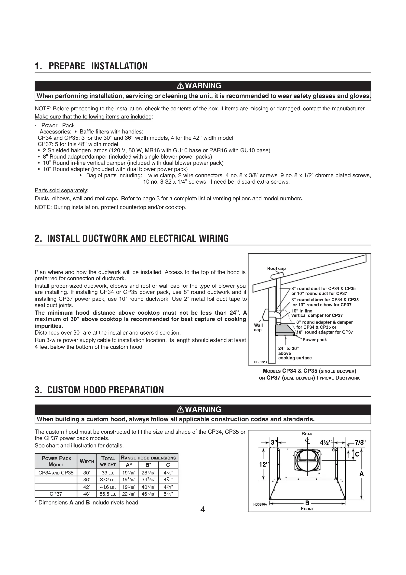 Plan where and how the ductwork will be installed. Access to the top of the hood is preferred for connection of ductwork. Install proper-sized ductwork, elbows and roof or wall cap for the type of blower you are installing. If installing CP34 or CP35 power pack, use 8” round ductwork and if installing CP37 power pack, use 10” round ductwork. Use 2” metal foil duct tape to seal duct joints. The minimum hood distance above cooktop must not be less than 24”. A maximum of 30” above cooktop is recommended for best capture of cooking impurities. Distances over 30” are at the installer and users discretion. Run 3-wire power supply cable to installation location. Its length should extend at least 4 feet below the bottom of the custom hood.