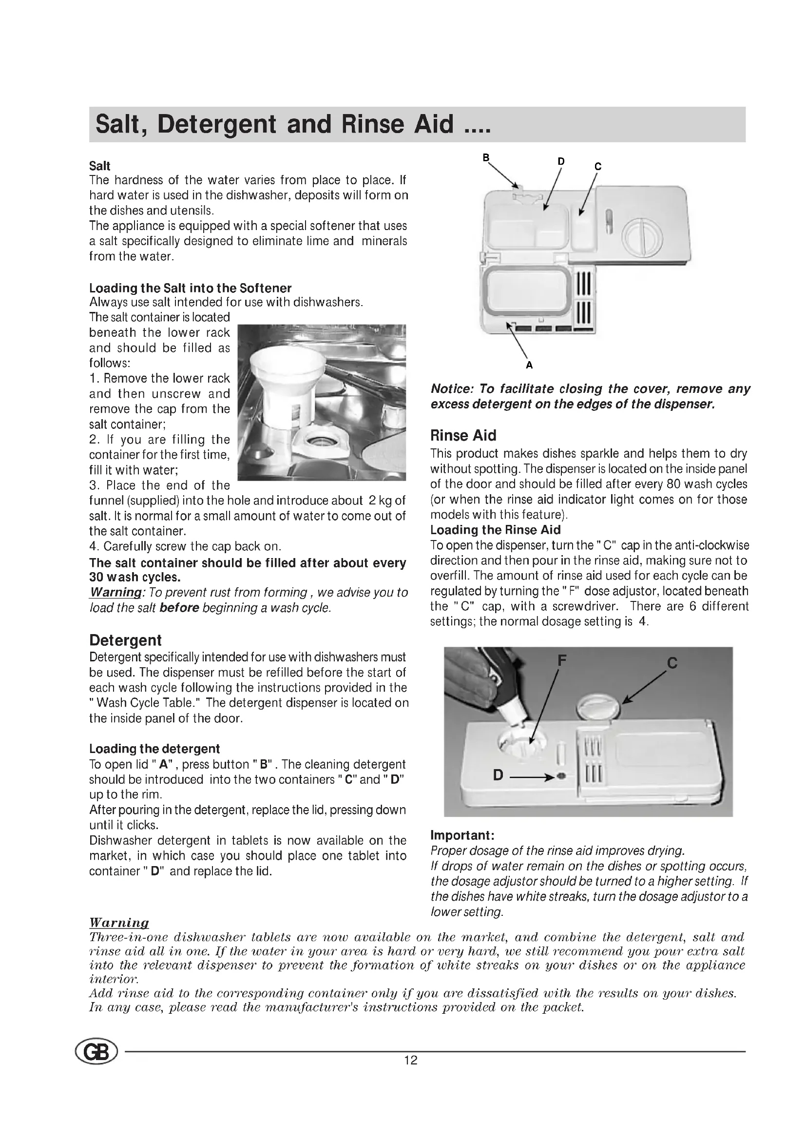 Salt, Detergent and Rinse Aid .... Salt The hardness of the water varies from place to place. Ifhard water is used in the dishwasher, deposits will form onthe dishes and utensils.The appliance is equipped with a special softener that usesa salt specifically designed to eliminate lime and mineralsfrom the water.Loading the Salt into the SoftenerAlways use salt intended for use with dishwashers.The salt container is locatedbeneath the lower rackand should be filled asfollows:1. Remove the lower rackand then unscrew andremove the cap from thesalt container;2. If you are filling thecontainer for the first time,fill it with water;3. Place the end of thefunnel (supplied) into the hole and introduce about 2 kg ofsalt. It is normal for a small amount of water to come out ofthe salt container.4. Carefully screw the cap back on.The salt container should be filled after about every30 wash cycles.Warning: To prevent rust from forming , we advise you toload the salt before beginning a wash cycle. Detergent Detergent specifically intended for use with dishwashers mustbe used. The dispenser must be refilled before the start ofeach wash cycle following the instructions provided in the"Wash Cycle Table." The detergent dispenser is located onthe inside panel of the door.Loading the detergent To open lid "A", press button "B". The cleaning detergent should be introduced into the two containers "C"and "D" up to the rim.After pouring in the detergent, replace the lid, pressing downuntil it clicks.Dishwasher detergent in tablets is now available on themarket, in which case you should place one tablet intocontainer "D" and replace the lid.Notice: To facilitate closing the cover, remove anyexcess detergent on the edges of the dispenser. Rinse Aid This product makes dishes sparkle and helps them to drywithout spotting. The dispenser is located on the inside panelof the door and should be filled after every 80 wash cycles(or when the rinse aid indicator light comes on for thosemodels with this feature).Loading the Rinse AidTo open the dispenser, turn the "C" cap in the anti-clockwisedirection and then pour in the rinse aid, making sure not tooverfill. The amount of rinse aid used for each cycle can beregulated by turning the "F" dose adjustor, located beneaththe "C" cap, with a screwdriver. There are 6 differentsettings; the normal dosage setting is 4.Important:Proper dosage of the rinse aid improves drying.If drops of water remain on the dishes or spotting occurs,the dosage adjustor should be turned to a higher setting. Ifthe dishes have white streaks, turn the dosage adjustor to alower setting. Warning Three-in-one dishwasher tablets are now available on the market, and combine the detergent, salt and rinse aid all in one. If the water in your area is hard or very hard, we still recommend you pour extra salt into the relevant dispenser to prevent the formation of white streaks on your dishes or on the appliance interior. Add rinse aid to the corresponding container only if you are dissatisfied with the results on your dishes. In any case, please read the manufacturer's instructions provided on the packet.