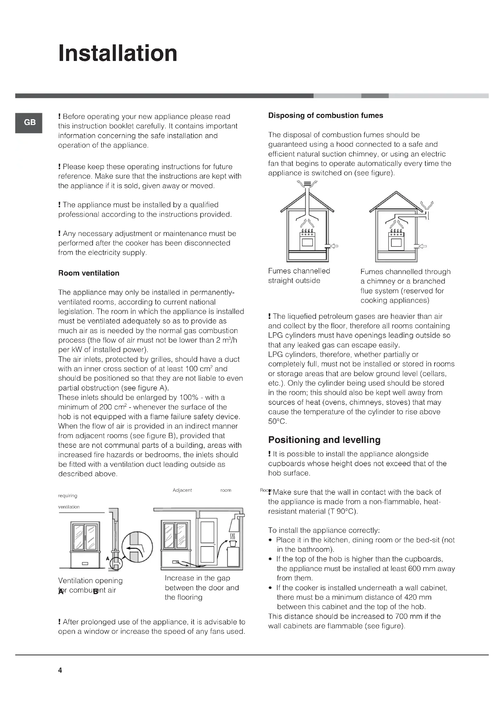- If the cooker is installed underneath a wall cabinet, there must be a minimum distance of 420 mm between this cabinet and the top of the hob. This distance should be increased to 700 mm if the wall cabinets are flammable (see figure). Ventilation opening for comburent air Increase in the gap between the door and the flooring Fumes channelled straight outside Fumes channelled through a chimney or a branched flue system (reserved for cooking appliances)GB