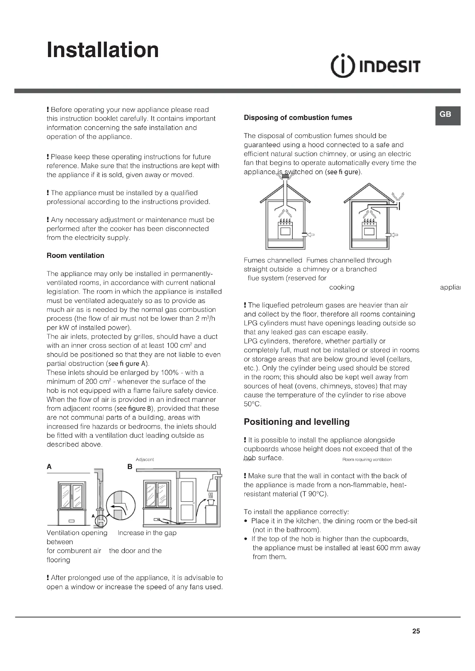 - whenever the surface of the hob is not equipped with a flame failure safety device. When the flow of air is provided in an indirect manner from adjacent rooms (see gure B), provided that these are not communal parts of a building, areas with increased fire hazards or bedrooms, the inlets should be fitted with a ventilation duct leading outside as described above. Adjacent room Room requiring ventilation A B Disposing of combustion fumes The disposal of combustion fumes should be guaranteed using a hood connected to a safe and efficient natural suction chimney, or using an electric fan that begins to operate automatically every time the appliance is switched on (see gure). Installation
