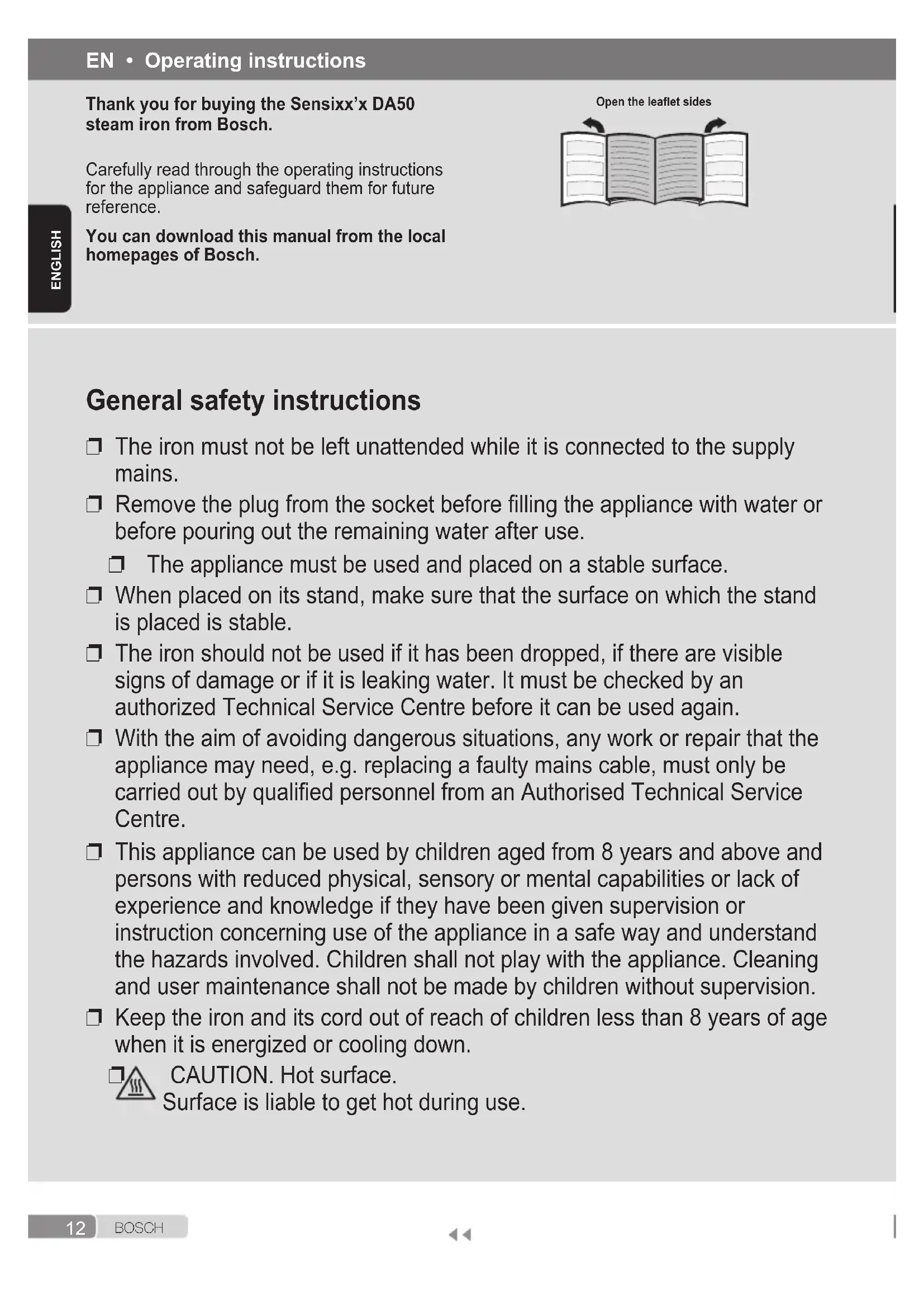 CAUTION. Hot surface. Surface is liable to get hot during use. EN • Operating instructions Thank you for buying the Sensixx’x DA50 steam iron from Bosch. Carefully read through the operating instructions for the appliance and safeguard them for future reference. You can download this manual from the local homepages of Bosch. Open the leaet sides13 B O S C H
