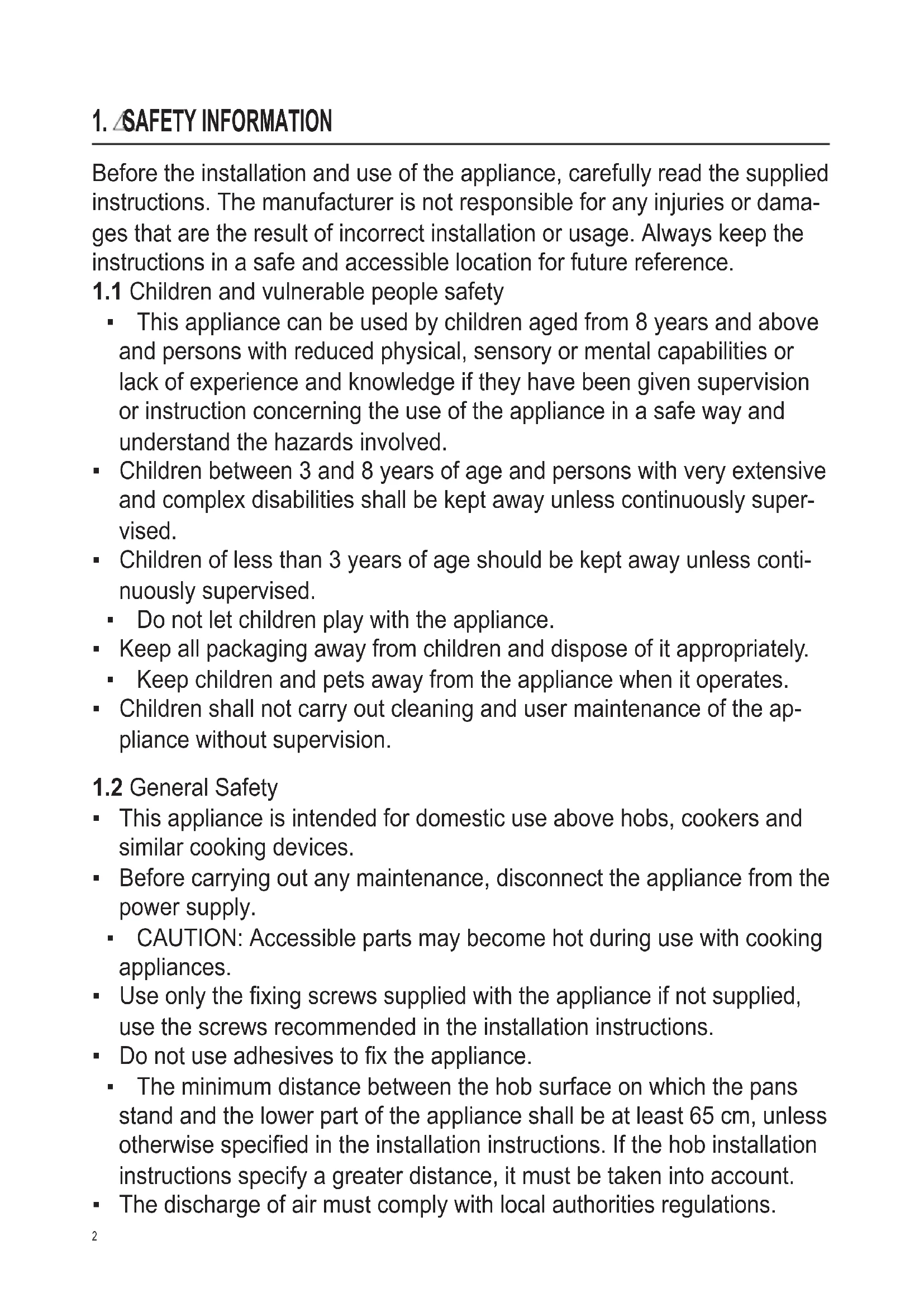 - This appliance is intended for domestic use above hobs, cookers and similar cooking devices.