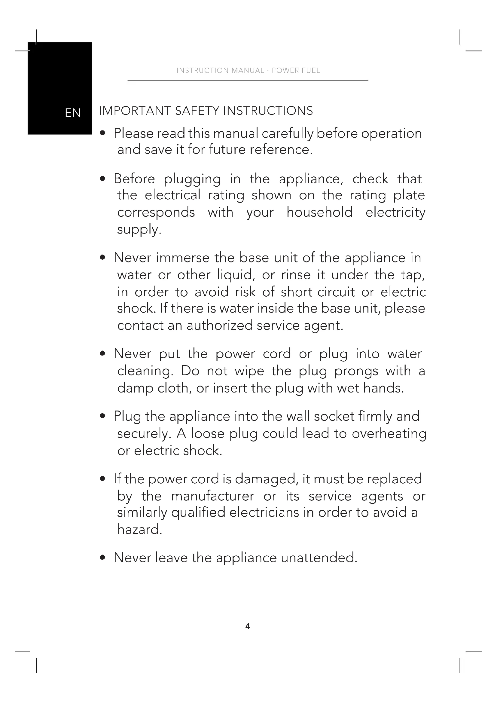 - Never immerse the base unit of the appliance in water or other liquid, or rinse it under the tap, in order to avoid risk of short-circuit or electric shock. If there is water inside the base unit, please contact an authorized service agent.