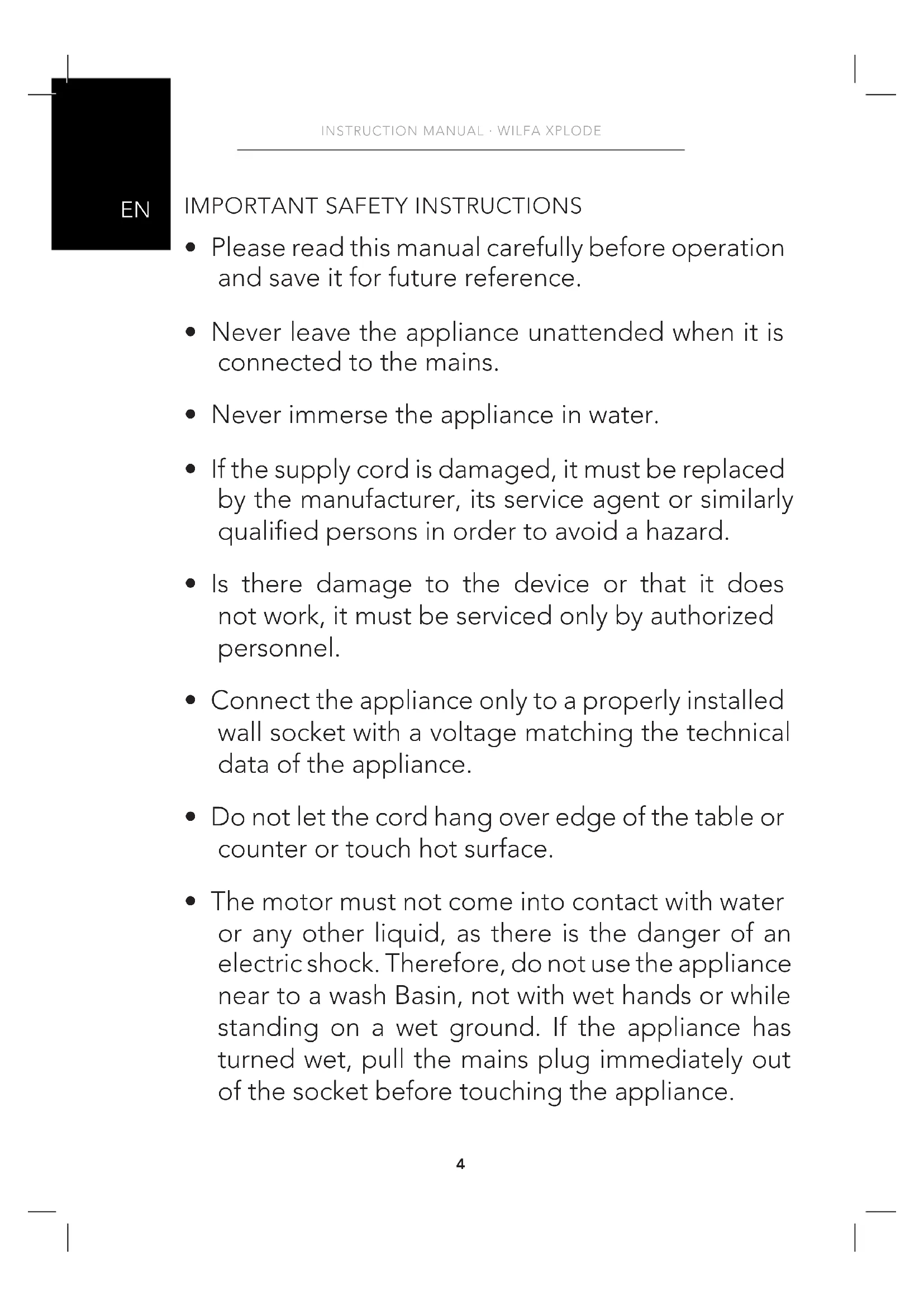 - The motor must not come into contact with water or any other liquid, as there is the danger of an electric shock. Therefore, do not use the appliance near to a wash Basin, not with wet hands or while standing on a wet ground. If the appliance has turned wet, pull the mains plug immediately out of the socket before touching the appliance.5