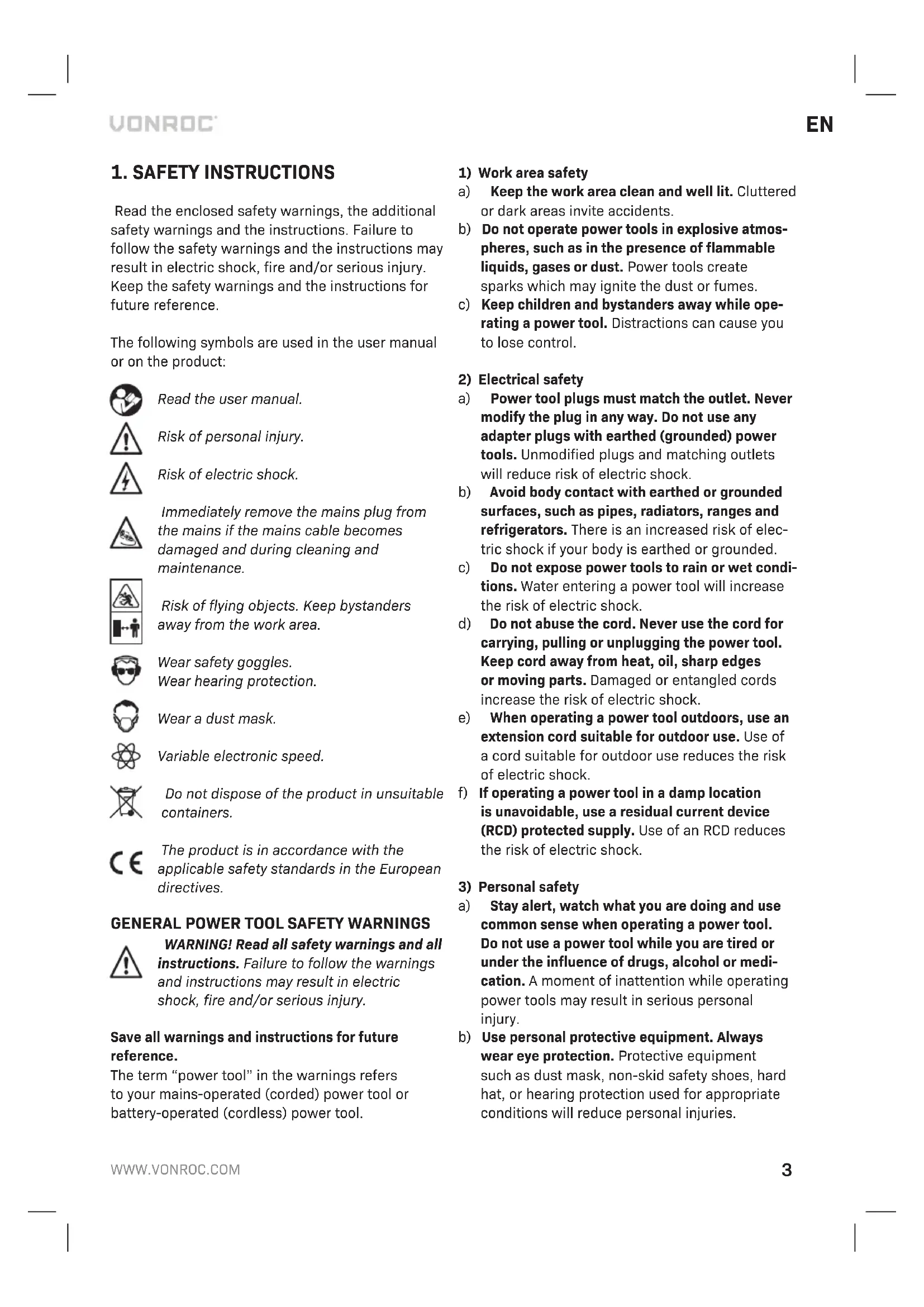 Read the enclosed safety warnings, the additional safety warnings and the instructions. Failure to follow the safety warnings and the instructions may result in electric shock, fire and/or serious injury. Keep the safety warnings and the instructions for future reference. The following symbols are used in the user manual or on the product: Read the user manual. Risk of personal injury. Risk of electric shock. Immediately remove the mains plug from the mains if the mains cable becomes damaged and during cleaning and maintenance. Risk of flying objects. Keep bystanders away from the work area. Wear safety goggles. Wear hearing protection. Wear a dust mask. Variable electronic speed. Do not dispose of the product in unsuitable containers. The product is in accordance with the applicable safety standards in the European directives.