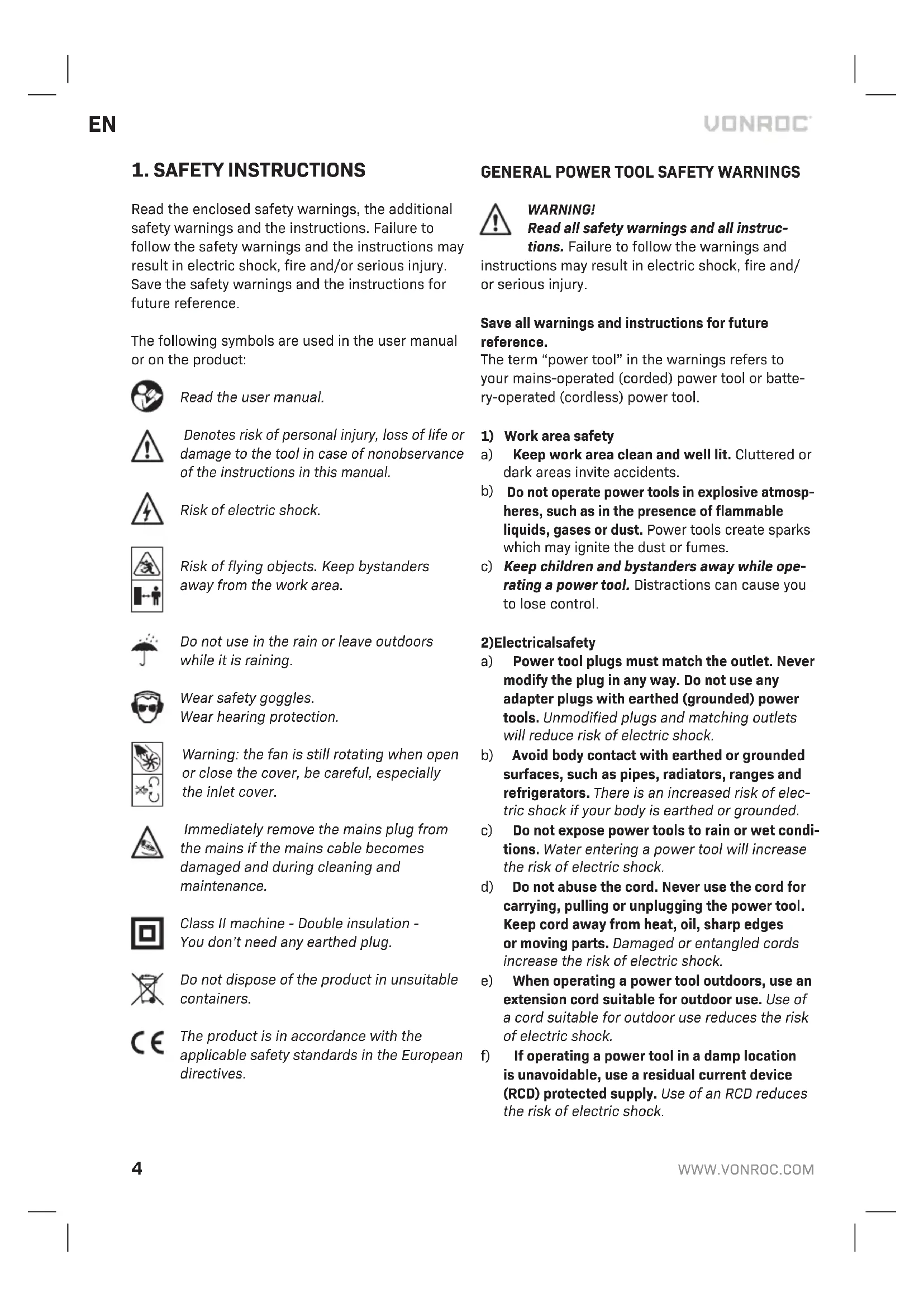 Before cleaning and maintenance, always switch off the machine and remove the mains plug from the mains. Clean the machine casings regularly with a soft cloth, preferably after each use. Make sure that the ventilation openings are free of dust and dirt. Re- move very persistent dirt using a soft cloth moiste- ned with soapsuds. Do not use any solvents such as gasoline, alcohol, ammonia, etc. Chemicals such as these will damage the synthetic components. ENVIRONMENT Faulty and/or discarded electrical or electronic apparatus have to be collected at the appropriate recycling locations. Only for EC countries Do not dispose of power tools into domestic waste. According to the European Guideline 2012/19/ EC for Waste Electrical and Electronic Equipment and its implementation into national right, power tools that are no longer usable must be collected separately and disposed of in an environmentally friendly way. WARRANTY VONROC products are developed to the highest quality standards and are guaranteed free of defects in both materials and workmanship for the period lawfully stipulated starting from the date of original purchase. Should the product develop any failure during this period due to defective material and/or workmanship then contact VONROC directly. The following circumstances are excluded from this guarantee: