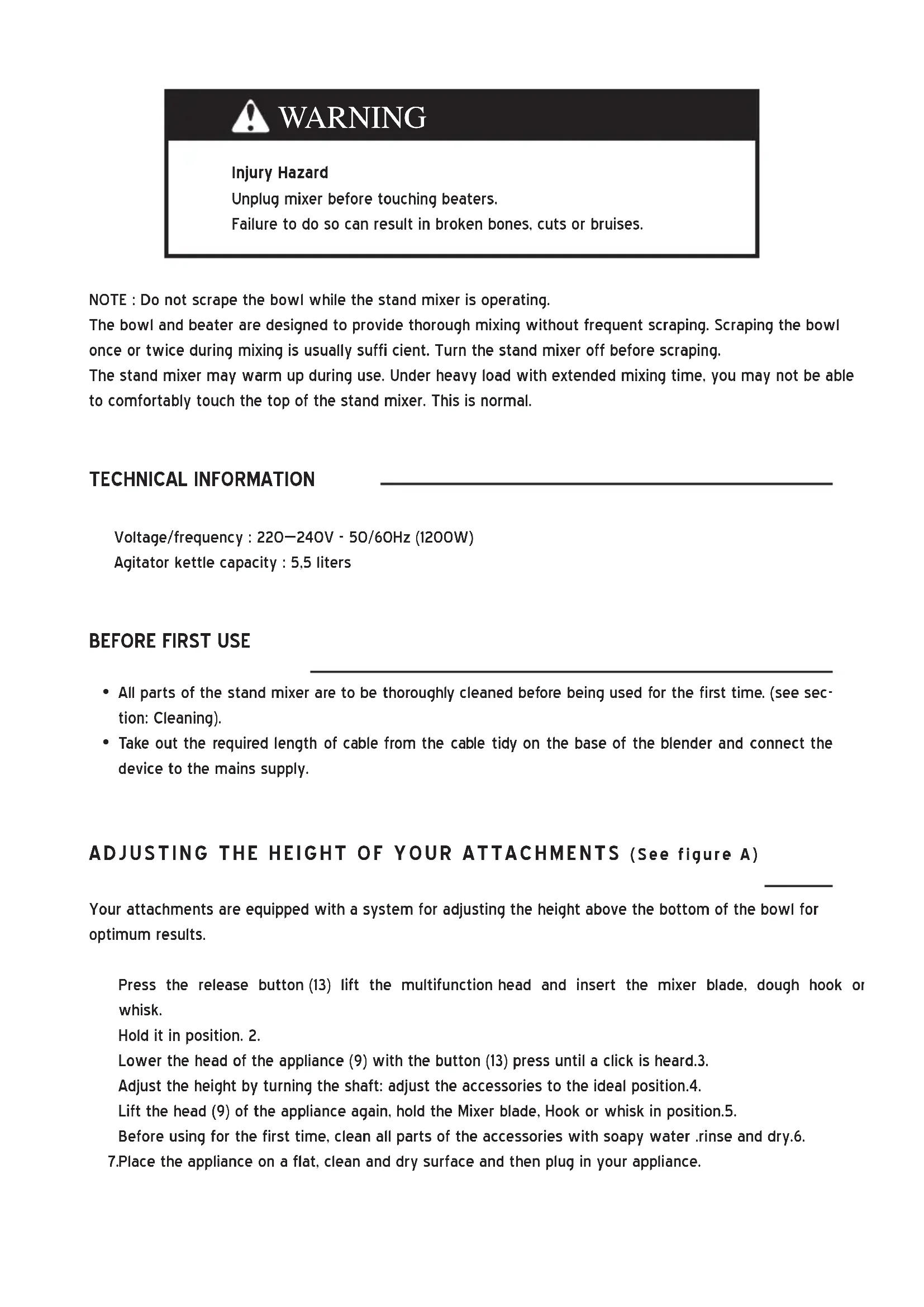 ENGLISHInjury Hazard Unplug mixer before touching beaters. Failure to do so can result in broken bones, cuts or bruises. NOTE : Do not scrape the bowl while the stand mixer is operating. The bowl and beater are designed to provide thorough mixing without frequent scraping. Scraping the bowl once or twice during mixing is usually suffi cient. Turn the stand mixer off before scraping. The stand mixer may warm up during use. Under heavy load with extended mixing time, you may not be able to comfortably touch the top of the stand mixer. This is normal. TECHNICAL INFORMATION Voltage/frequency : 220—240V - 50/60Hz (1200W) Agitator kettle capacity : 5,5 liters