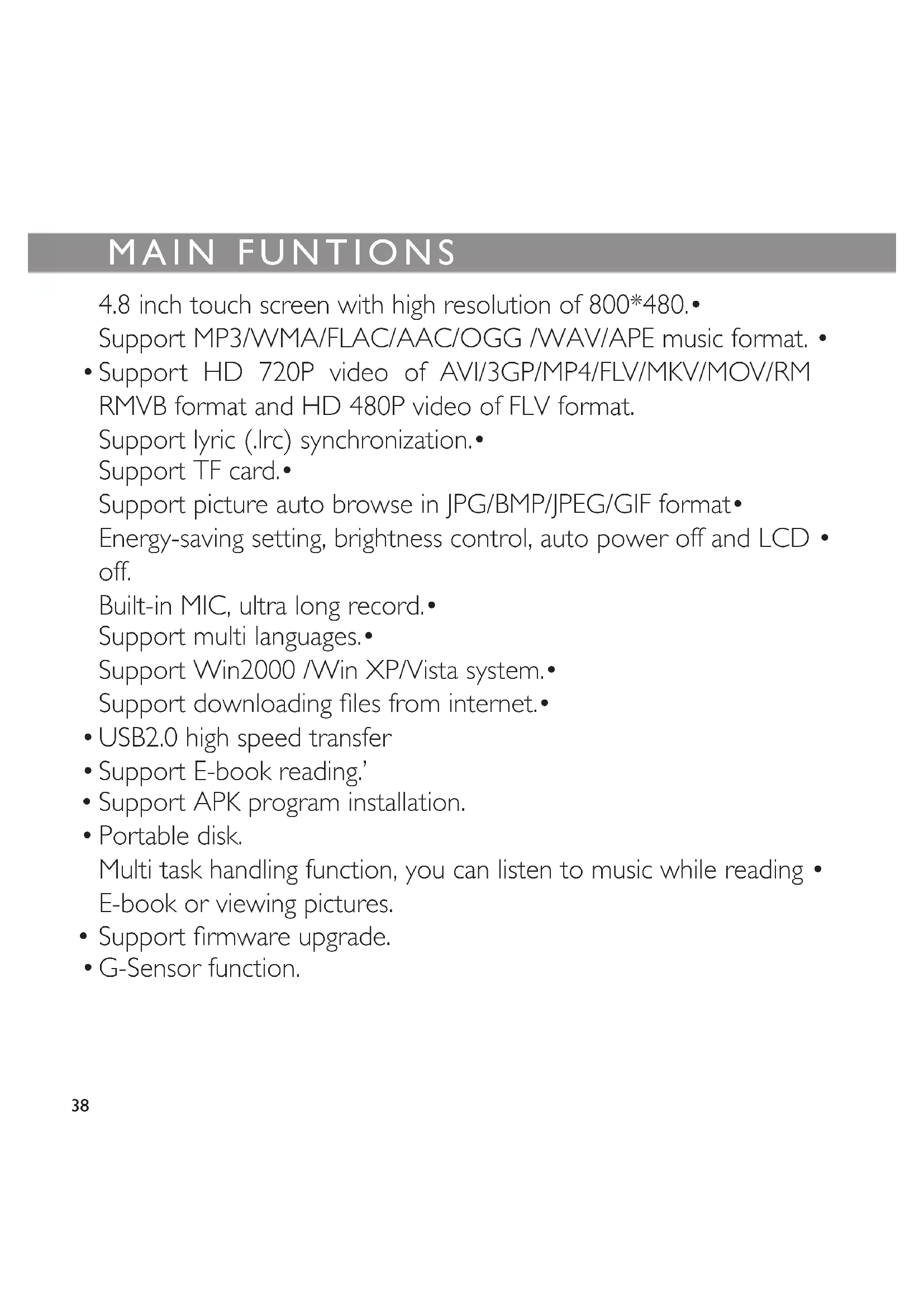 Support MP3/WMA/FLAC/AAC/OGG /WAV/APE music format. • Support HD 720P video of AVI/3GP/MP4/FLV/MKV/MOV/RM • RMVB format and HD 480P video of FLV format. Support lyric (.lrc) synchronization.• Support TF card.• Support picture auto browse in JPG/BMP/JPEG/GIF format• Energy-saving setting, brightness control, auto power off and LCD • off. Built-in MIC, ultra long record.• Support multi languages.• Support Win2000 /Win XP/Vista system.• Supportdownloadinglesfrominternet.• USB2.0 high speed transfer• Support E-book reading.’• Support APK program installation.• Portable disk.• Multi task handling function, you can listen to music while reading • E-book or viewing pictures. Supportrmwareupgrade.• G-Sensor function.• MAIN fU cAUTIONS39