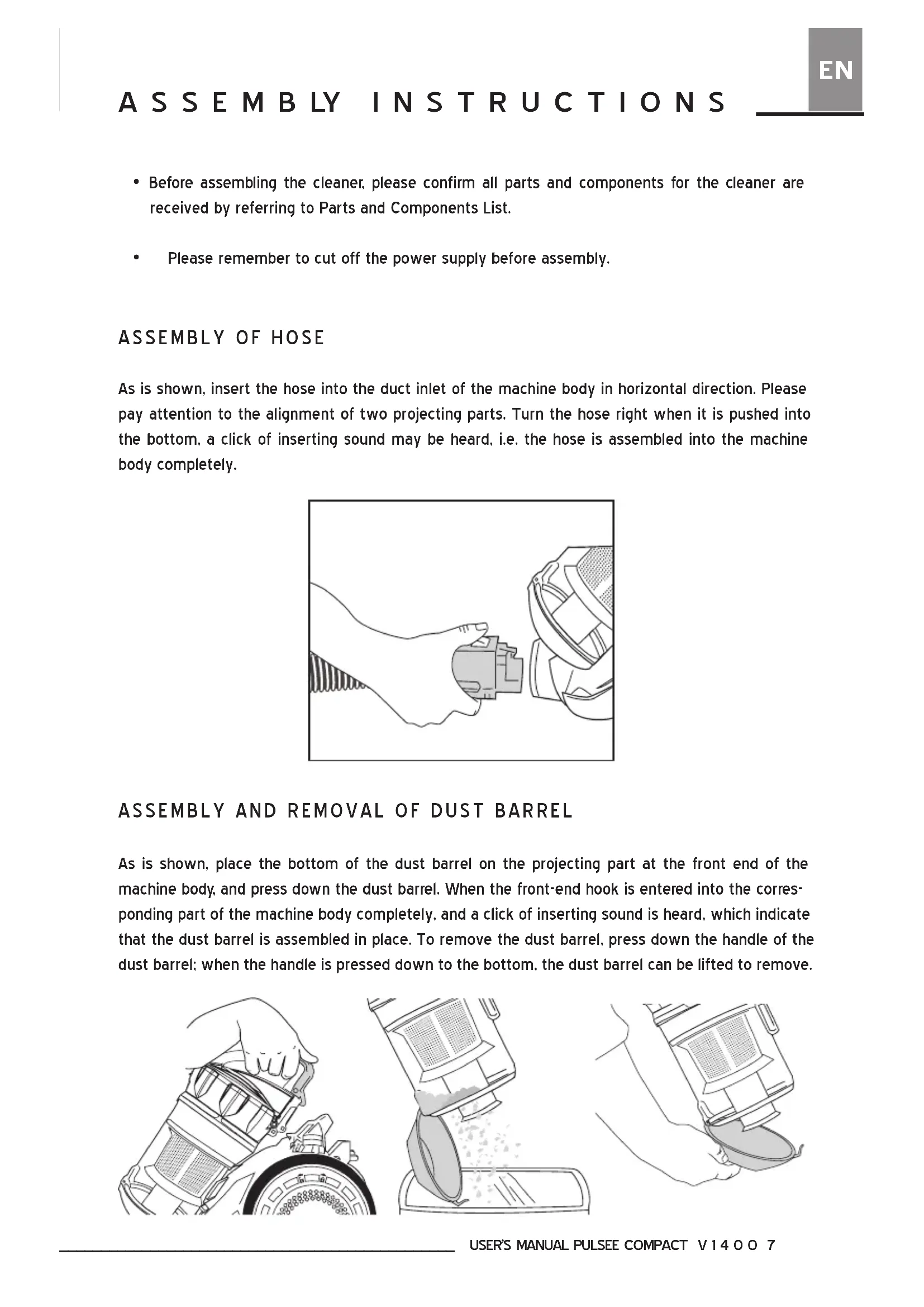As is shown, place the bottom of the dust barrel on the projecting part at the front end of the machine body, and press down the dust barrel. When the front-end hook is entered into the corres- ponding part of the machine body completely, and a click of inserting sound is heard, which indicate that the dust barrel is assembled in place. To remove the dust barrel, press down the handle of the dust barrel; when the handle is pressed down to the bottom, the dust barrel can be lifted to remove.8 USER’S MANUAL PULSEE COMPACT V 1 4 0 0 ________________________________________________ ASSEMBLY OF METAL EXTENSION PIPE AND FLOOR BRUSH Insert the front end of the hose handle into the metal extension pipe according; then insert the other end of the metal extension pipe into the rounded inlet of the floor brush, and adjust to the proper direction. At this time, the assembly of the whole machine is completed.________________________________________________ USER’S MANUAL PULSEE COMPACT V 1 4 0 0 9