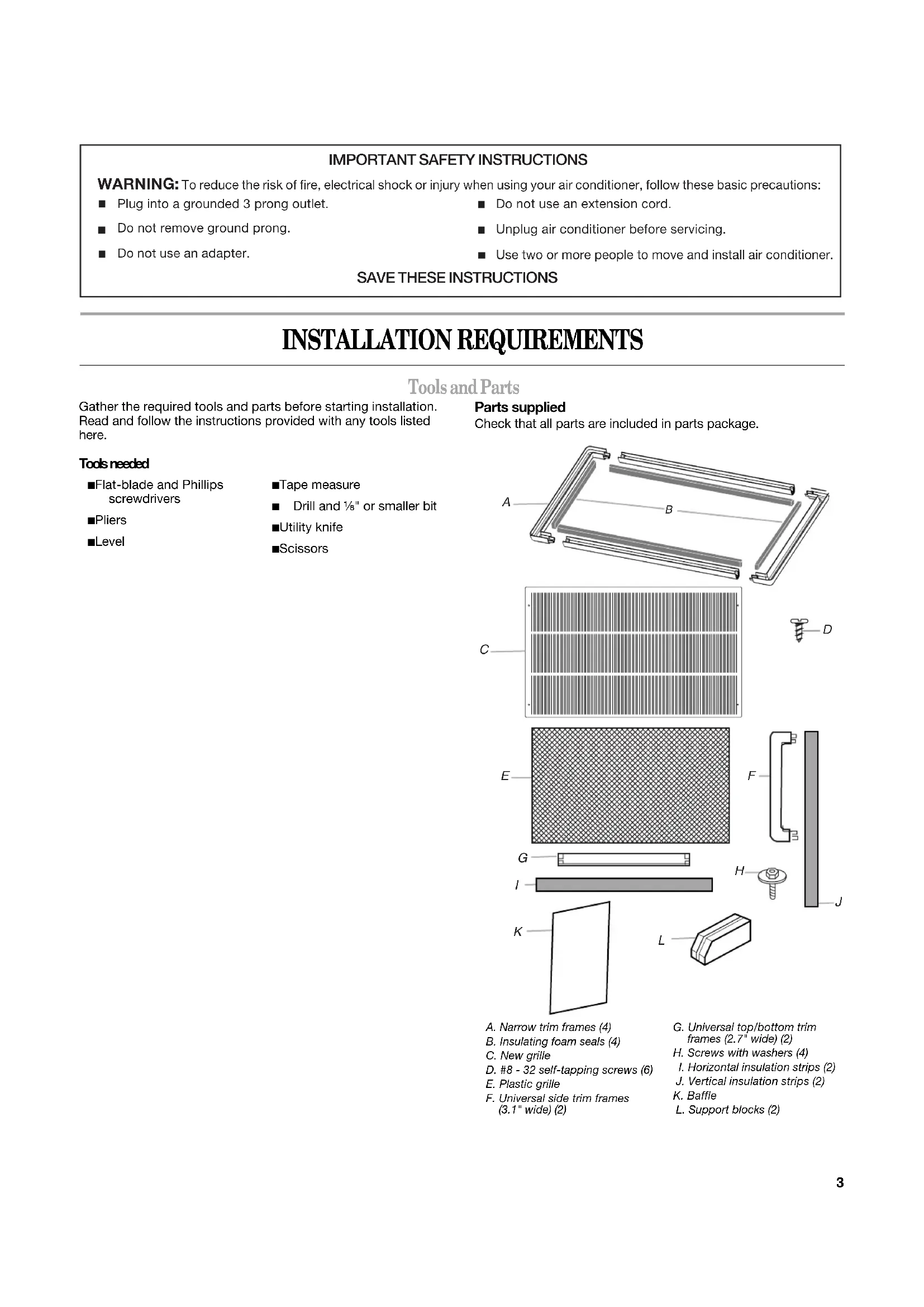 Unplug air conditioner before servicing.Use two or more people to move and install air conditioner.Plug into a grounded 3 prong outlet.Do not remove ground prong.Do not use an adapter.Do not use an extension cord.■ Flat-blade and Phillips screwdrivers■ Pliers■ Level■ Tape measure ■ Drill and ¹⁄₈" or smaller bit ■ Utility knife■ ScissorsA. Narrow trim frames (4)B. Insulating foam seals (4)C. New grille D. #8 - 32 self-tapping screws (6) E. Plastic grilleF. Universal side trim frames (3.1" wide) (2)G. Universal top/bottom trim frames (2.7" wide) (2)H. Screws with washers (4)I. Horizontal insulation strips (2)J. Vertical insulation strips (2)K. BaffleL. Support blocks (2) AC Parts Supplied 5A.eps