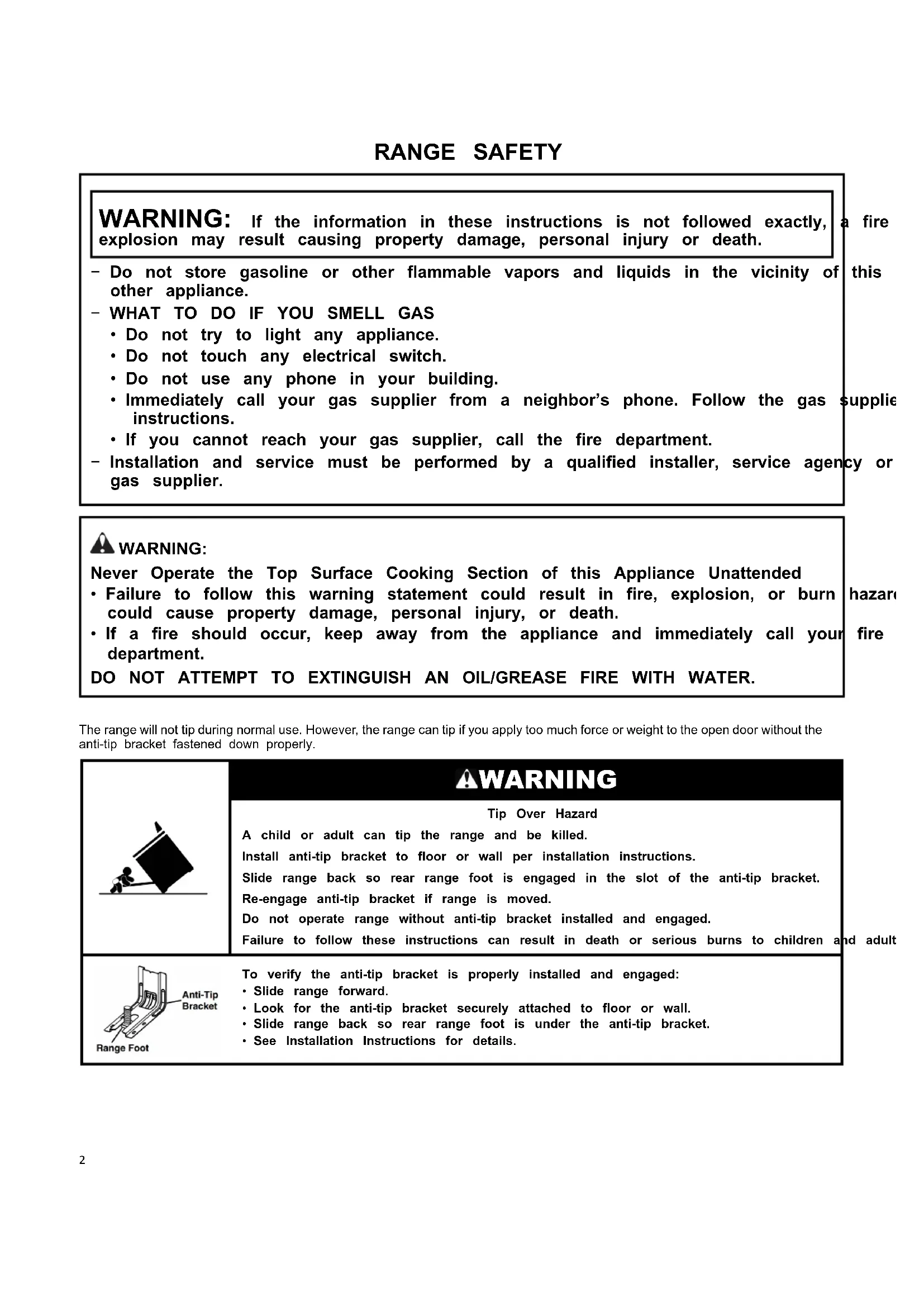 - If a fire should occur, keep away from the appliance and immediately call your fire department. DO NOT ATTEMPT TO EXTINGUISH AN OIL/GREASE FIRE WITH WATER. The range will not tip during normal use. However, the range can tip if you apply too much force or weight to the open door without the anti-tip bracket fastened down properly. WARNING Tip Over Hazard A child or adult can tip the range and be killed. Install anti-tip bracket to floor or wall per installation instructions. Slide range back so rear range foot is engaged in the slot of the anti-tip bracket. Re-engage anti-tip bracket if range is moved. Do not operate range without anti-tip bracket installed and engaged. Failure to follow these instructions can result in death or serious burns to children and adults. To verify the anti-tip bracket is properly installed and engaged: