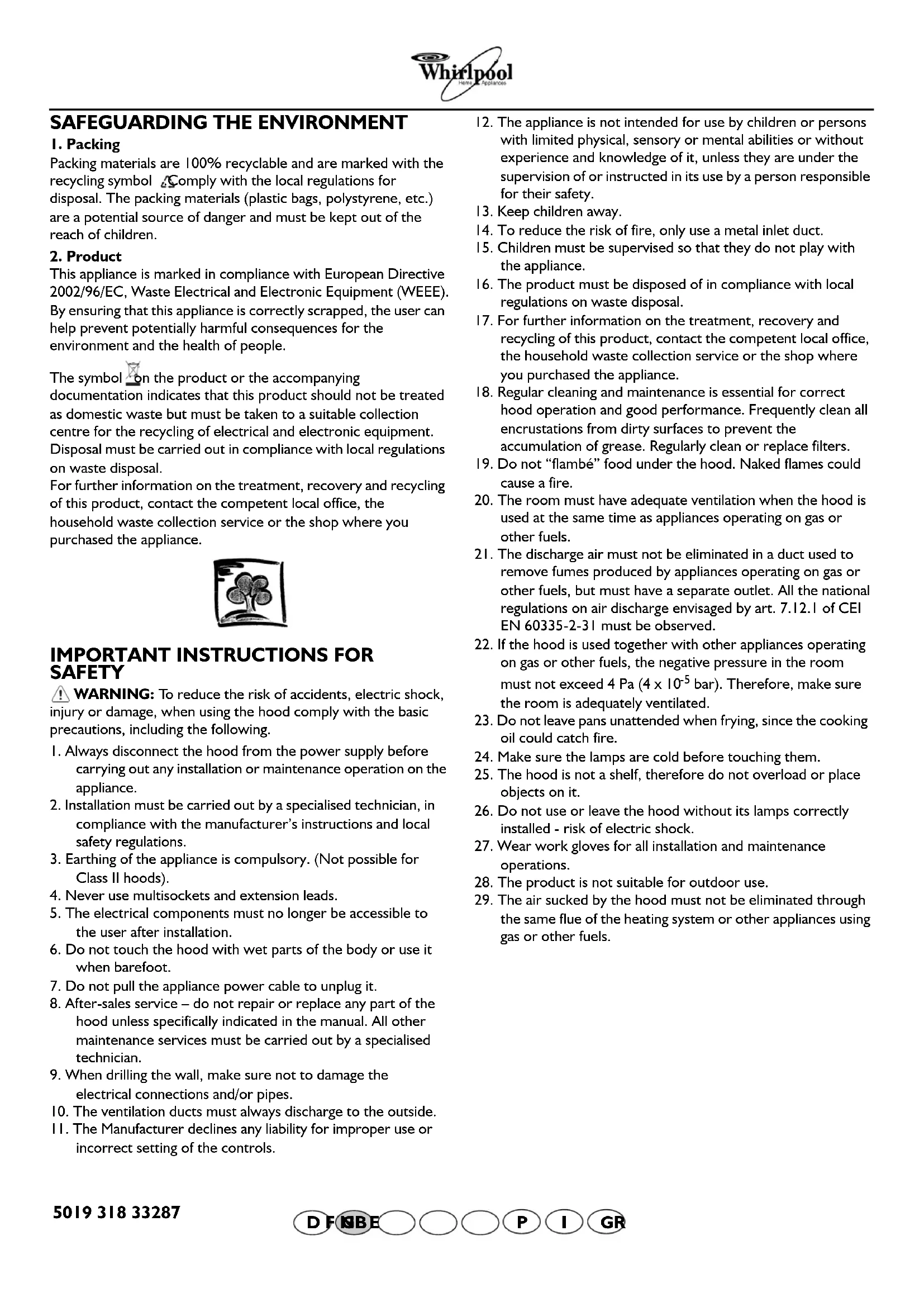 PIGR5019 318 33287 Electrical connection The mains voltage must match that given on the rating plate located inside the hood. If provided with a plug, connect the hood to a socket complying with the current regulations and located in an accessible area. If it does not have a plug (direct connection to the power supply) or if the plug is not in an accessible place, fit a suitable double-pole switch that ensures complete disconnection from the power supply in category III overvoltage conditions, complying with the installation rules.