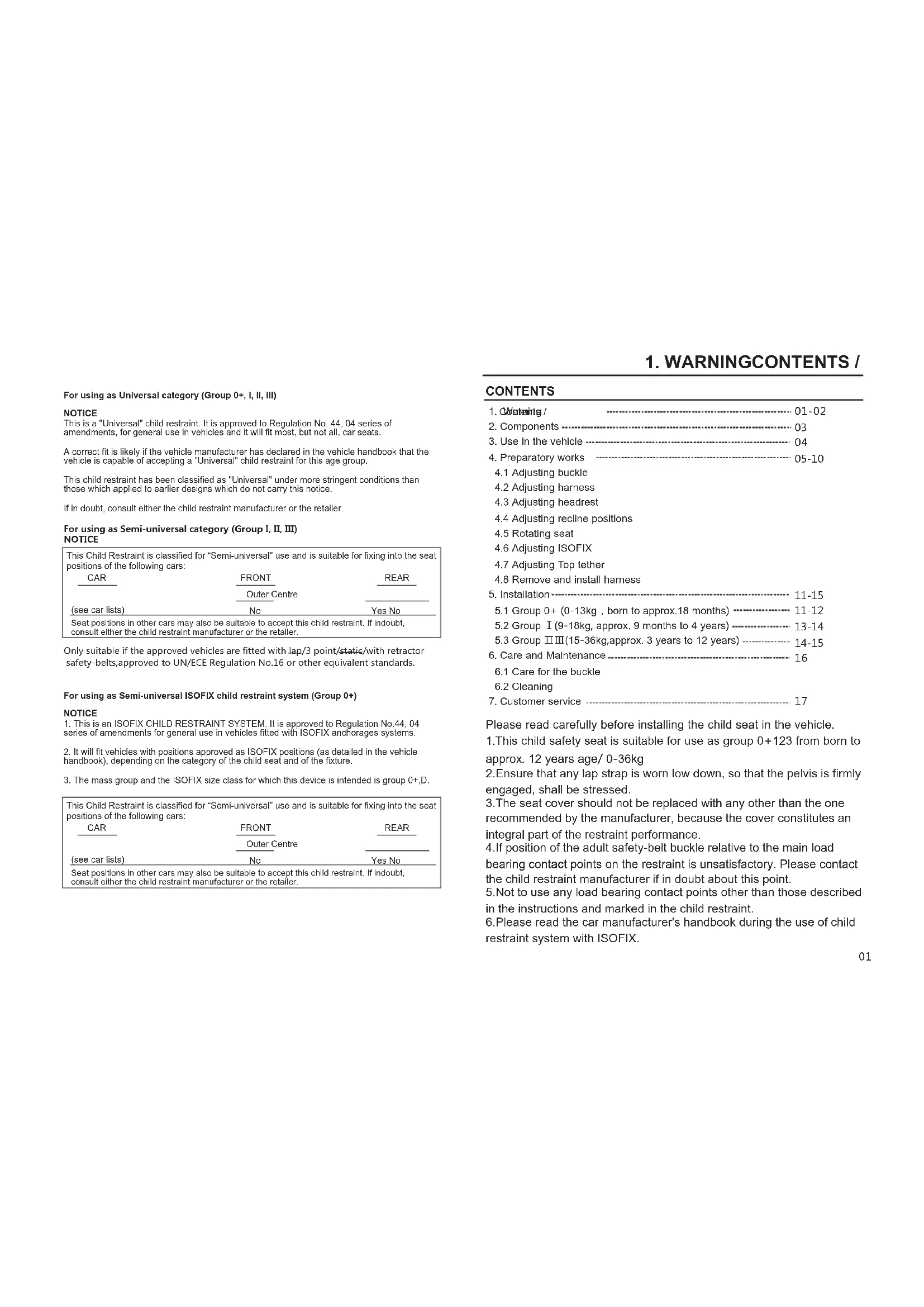 Please read carefully before installing the child seat in the vehicle. 1.This child safety seat is suitable for use as group 0+123 from born to approx. 12 years age/ 0-36kg 2.Ensure that any lap strap is worn low down, so that the pelvis is firmly engaged, shall be stressed. 3.The seat cover should not be replaced with any other than the one recommended by the manufacturer, because the cover constitutes an integral part of the restraint performance. 4.If position of the adult safety-belt buckle relative to the main load bearing contact points on the restraint is unsatisfactory. Please contact the child restraint manufacturer if in doubt about this point. 5.Not to use any load bearing contact points other than those described in the instructions and marked in the child restraint. 6.Please read the car manufacturer's handbook during the use of child restraint system with ISOFIX. CAR (see car lists) Seat positions in other cars may also be suitable to accept this child restraint. If indoubt, consult either the child restraint manufacturer or the retailer.