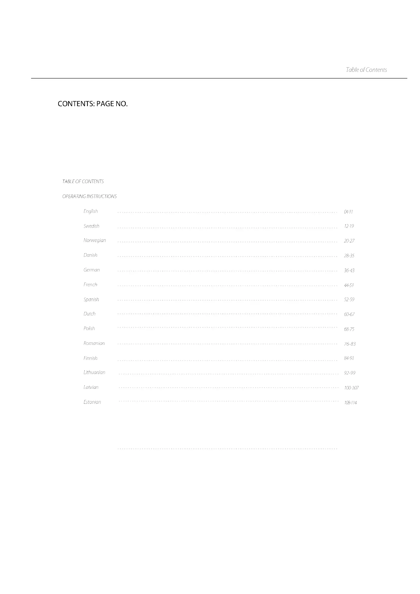 OPERATING INSTRUCTIONS English Swedish Norwegian Danish German French Spanish Dutch Polish Romanian Finnish Lithuanian Latvian Estonian 04-11 12-19 20-27 28-35 36-43 44-51 52-59 60-67 68-75 76-83 84-91 92-99 100-107 108-114GB