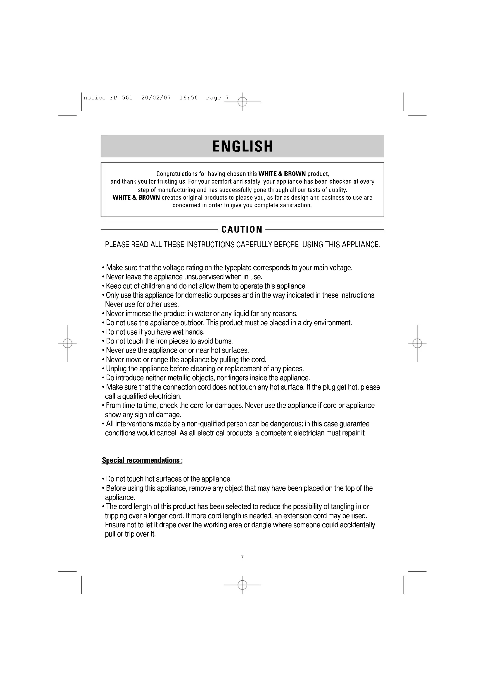 notice FP 561 20/02/07 16:56 Page 67 Congratulations for having chosen this WHITE & BROWN product, and thank you for trusting us. For your comfort and safety, your appliance has been checked at every step of manufacturing and has successfully gone through all our tests of quality. WHITE & BROWN creates original products to please you, as far as design and easiness to use are concerned in order to give you complete satisfaction. ENGLISH ENGLISH CAUTION CAUTION PLEASE READ ALL THESE INSTRUCTIONS CAREFULLY BEFORE USING THIS APPLIANCE.