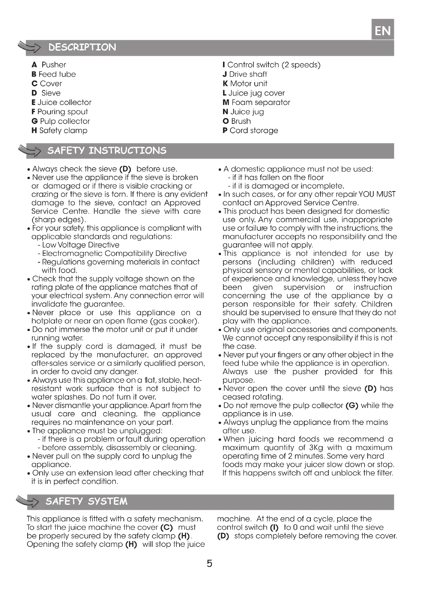 - When juicing hard foods we recommend a maximum quantity of 3Kg with a maximum operating time of 2 minutes. Some very hard foods may make your juicer slow down or stop. If this happens switch off and unblock the filter. SAFETY SYSTEM This appliance is fitted with a safety mechanism. To start the juice machine the cover (C) must be properly secured by the safety clamp (H). Opening the safety clamp (H) will stop the juice machine. At the end of a cycle, place the control switch (I) to 0 and wait until the sieve (D) stops completely before removing the cover. EN6