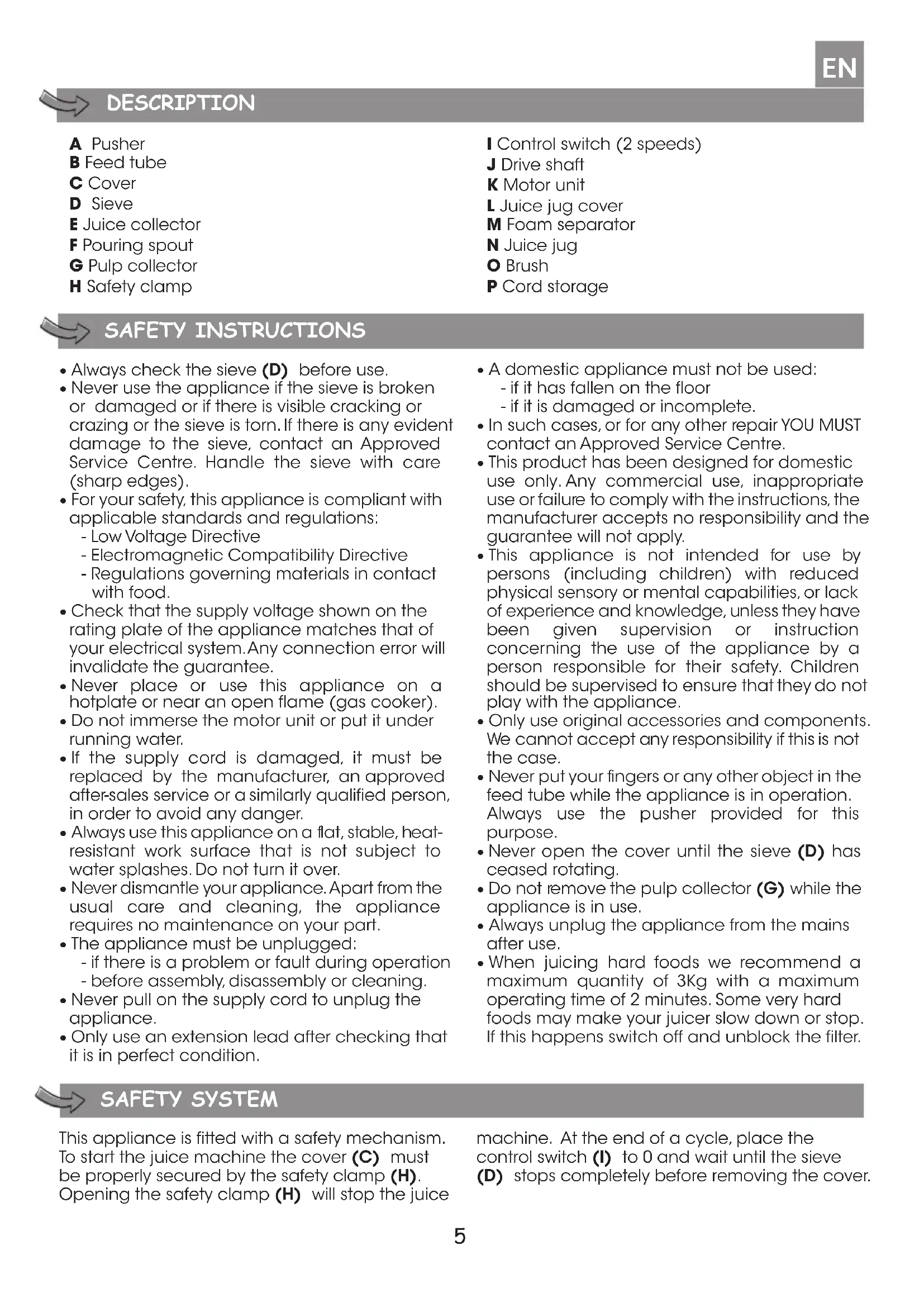 - When juicing hard foods we recommend a maximum quantity of 3Kg with a maximum operating time of 2 minutes. Some very hard foods may make your juicer slow down or stop. If this happens switch off and unblock the filter. SAFETY SYSTEM This appliance is fitted with a safety mechanism. To start the juice machine the cover (C) must be properly secured by the safety clamp (H). Opening the safety clamp (H) will stop the juice machine. At the end of a cycle, place the control switch (I) to 0 and wait until the sieve (D) stops completely before removing the cover. EN6