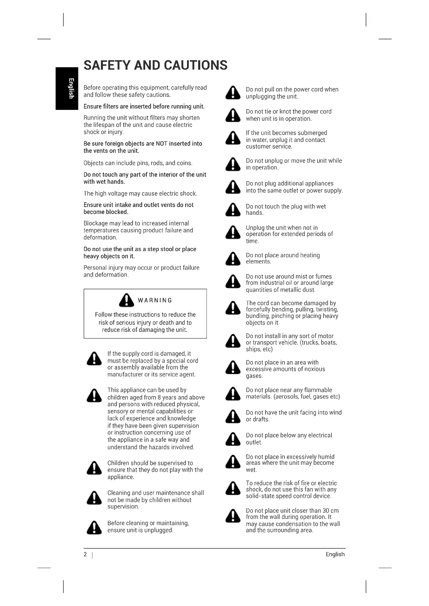 Before operating this equipment, carefully read and follow these safety cautions. Ensure filters are inserted before running unit. Running the unit without filters may shorten the lifespan of the unit and cause electric shock or injury. Be sure foreign objects are NOT inserted into the vents on the unit. Objects can include pins, rods, and coins. Do not touch any part of the interior of the unit with wet hands. The high voltage may cause electric shock. Ensure unit intake and outlet vents do not become blocked. Blockage may lead to increased internal temperatures causing product failure and deformation. Do not use the unit as a step stool or place heavy objects on it. Personal injury may occur or product failure and deformation. WARNING Follow these instructions to reduce the risk of serious injury or death and to reduce risk of damaging the unit. If the supply cord is damaged, it must be replaced by a special cord or assembly available from the manufacturer or its service agent. This appliance can be used by children aged from 8 years and above and persons with reduced physical, sensory or mental capabilities or lack of experience and knowledge if they have been given supervision or instruction concerning use of the appliance in a safe way and understand the hazards involved. Children should be supervised to ensure that they do not play with the appliance. Cleaning and user maintenance shall not be made by children without supervision. Before cleaning or maintaining, ensure unit is unplugged. Do not pull on the power cord when unplugging the unit. Do not tie or knot the power cord when unit is in operation. If the unit becomes submerged in water, unplug it and contact customer service. Do not unplug or move the unit while in operation. Do not plug additional appliances into the same outlet or power supply. Do not touch the plug with wet hands. Unplug the unit when not in operation for extended periods of time. Do not place around heating elements. Do not use around mist or fumes from industrial oil or around large quantities of metallic dust. The cord can become damaged by forcefully bending, pulling, twisting, bundling, pinching or placing heavy objects on it. Do not install in any sort of motor or transport vehicle. (trucks, boats, ships, etc) Do not place in an area with excessive amounts of noxious gases. Do not place near any flammable materials. (aerosols, fuel, gases etc) Do not have the unit facing into wind or drafts. Do not place below any electrical outlet. Do not place in excessively humid areas where the unit may become wet. To reduce the risk of fire or electric shock, do not use this fan with any solid-state speed control device. Do not place unit closer than 30 cm from the wall during operation. It may cause condensation to the wall and the surrounding area. SAFETY AND CAUTIONSEnglish English