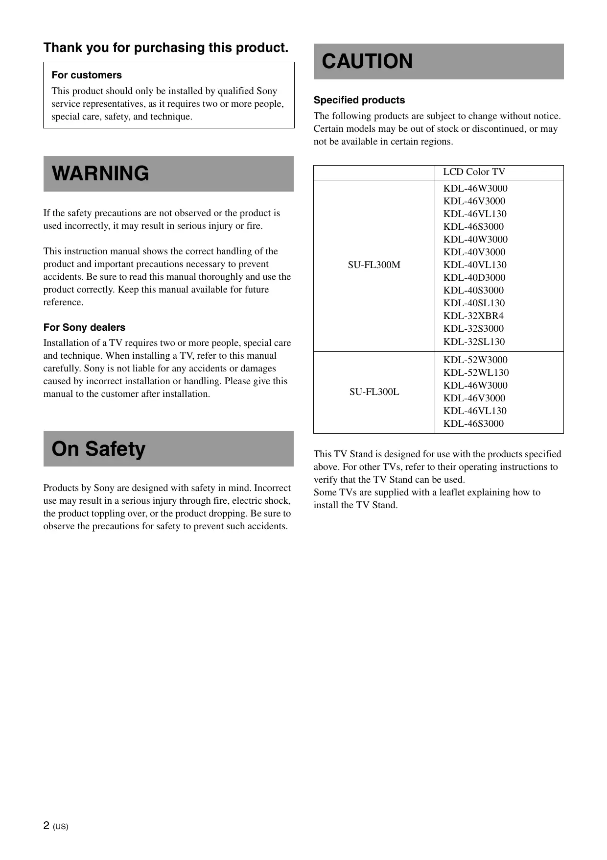 SU-FL300M SU-FL300L © 2007 Sony Corporation Thank you for purchasing this product. For customers This product should only be installed by qualified Sony service representatives, as it requires two or more people, special care, safety, and technique. CAUTION Specified products The following products are subject to change without notice. Certain models may be out of stock or discontinued, or may not be available in certain regions. WARNING LCD Color TV SU-FL300M If the safety precautions are not observed or the product is used incorrectly, it may result in serious injury or fire. This instruction manual shows the correct handling of the product and important precautions necessary to prevent accidents. Be sure to read this manual thoroughly and use the product correctly. Keep this manual available for future reference. For Sony dealers Installation of a TV requires two or more people, special care and technique. When installing a TV, refer to this manual carefully. Sony is not liable for any accidents or damages caused by incorrect installation or handling. Please give this manual to the customer after installation. On Safety Products by Sony are designed with safety in mind. Incorrect use may result in a serious injury through fire, electric shock, the product toppling over, or the product dropping. Be sure to observe the precautions for safety to prevent such accidents. 2 (US) This TV Stand is designed for use with the products specified above. For other TVs, refer to their operating instructions to verify that the TV Stand can be used. Some TVs are supplied with a leaflet explaining how to install the TV Stand. WARNING If the following precautions are not observed, serious injury or death can result through fire, electric shock, or the product toppling over. Products should only be installed by qualified Sony service representatives. The TV and the TV Stand are very heavy; installation by non-qualified persons could result in serious injury. Do not step on the TV Stand. You may fall, or break the glass and cause injury. Do not cover the ventilation holes of the TV. If you cover the ventilation holes (with a cloth, etc.), heat may build up inside and cause fire. Be sure to take measures to prevent the TV Stand from toppling over. If you fail to do so, the TV may topple over and cause injury. Anchor the TV to a wall, etc., to prevent toppling over. Be sure to install the TV Stand on a solid and flat floor. Do not use a cracked TV Stand. Do not use the TV Stand if it has sustained any cracks. The glass may break and cause the TV to topple over, which could cause serious injury or damage. Cracked TV Stand