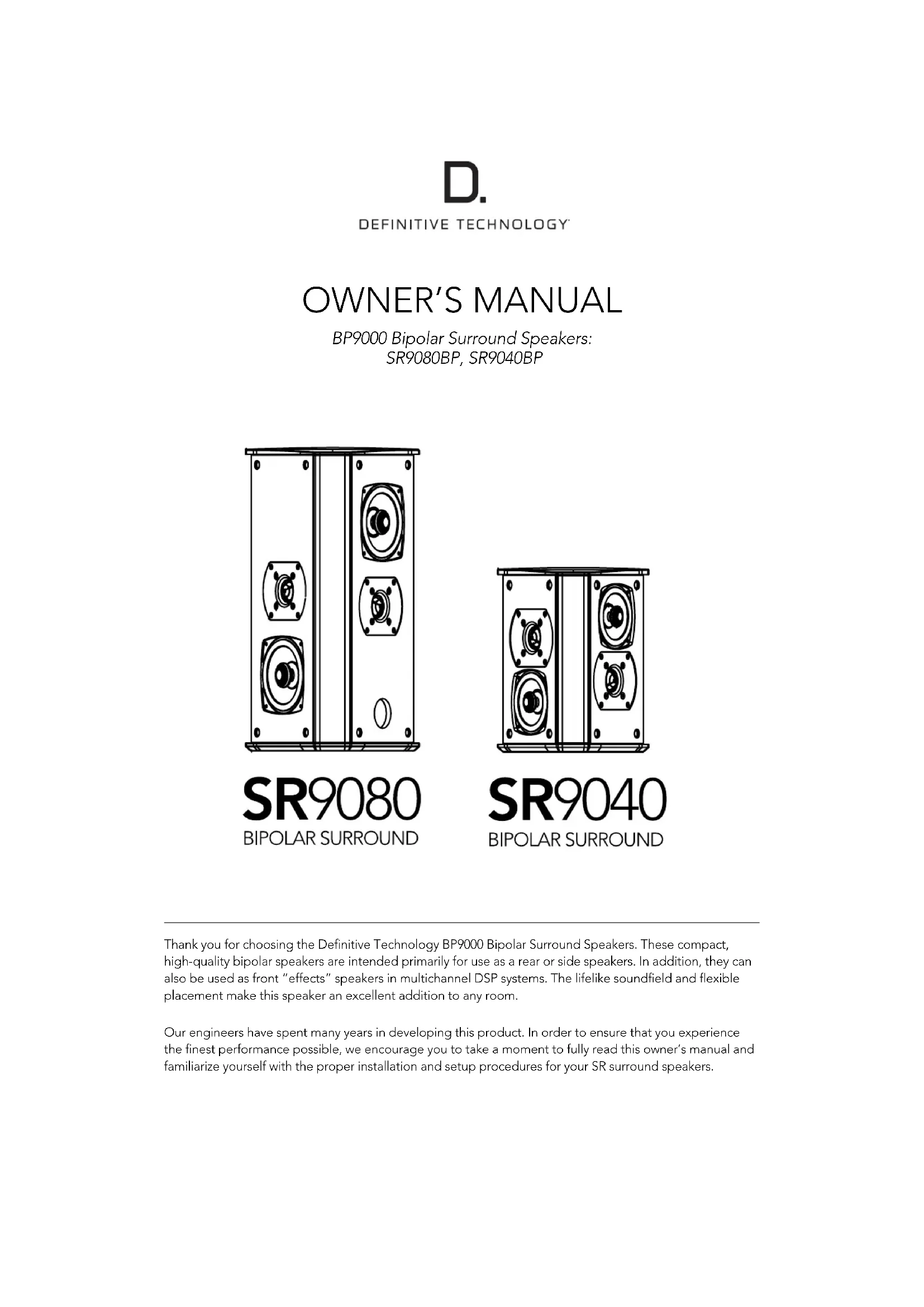 BP9000 Bipolar Surround Speakers: SR9080BP, SR9040BP Thank you for choosing the Definitive Technology BP9000 Bipolar Surround Speakers. These compact, high-quality bipolar speakers are intended primarily for use as a rear or side speakers. In addition, they can also be used as front “effects” speakers in multichannel DSP systems. The lifelike soundfield and flexible placement make this speaker an excellent addition to any room. Our engineers have spent many years in developing this product. In order to ensure that you experience the finest performance possible, we encourage you to take a moment to fully read this owner’s manual and familiarize yourself with the proper installation and setup procedures for your SR surround speakers.owner’s manual