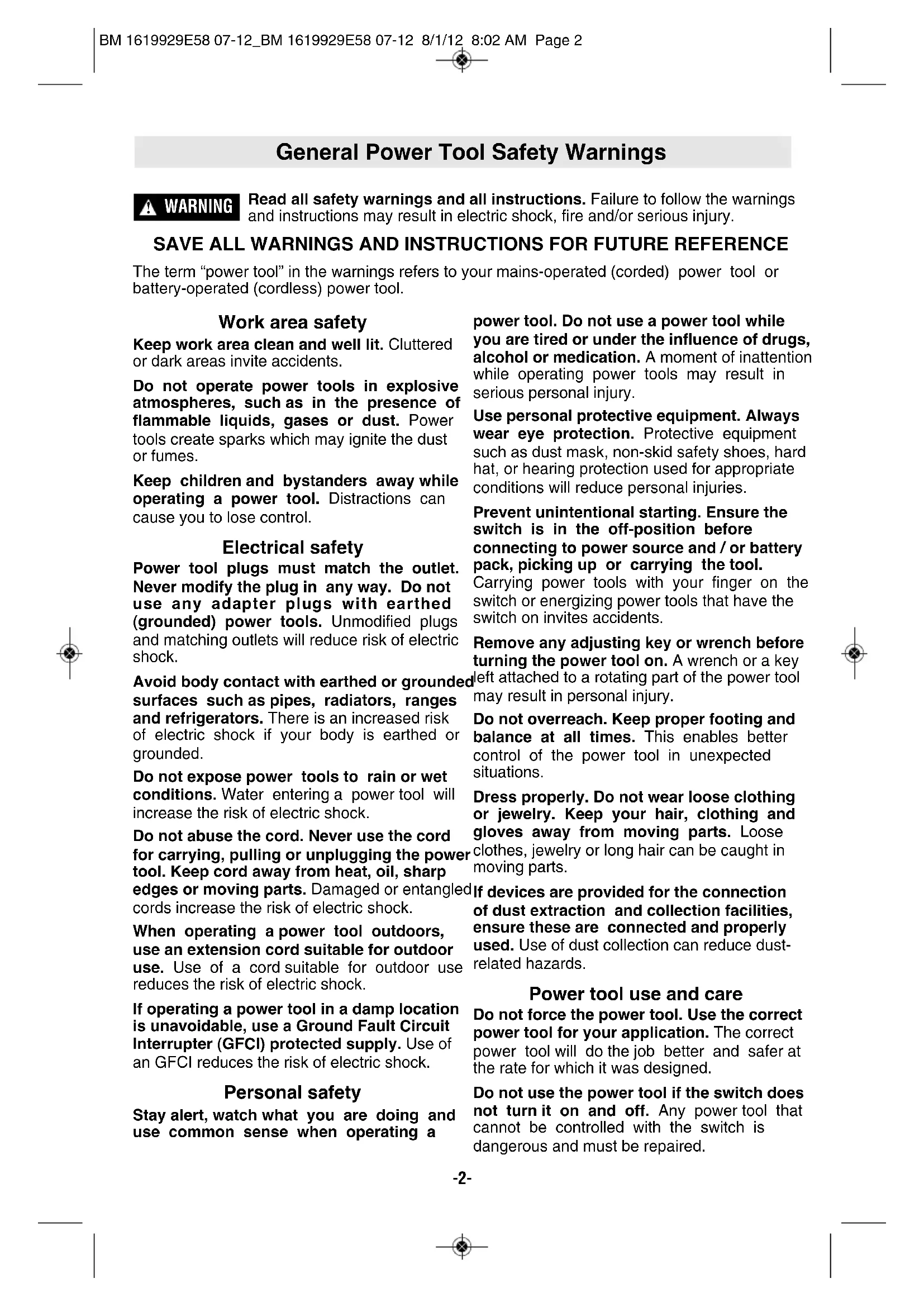 BM 1619929E58 07-12_BM 1619929E58 07-12 8/1/12 8:02 AM Page 5-6- This symbol designates that this tool is listed by Underwriters Laboratories. This symbol designates that this tool is listed by the Canadian Standards Association. This symbol designates that this tool is listed by the Canadian Standards Association, to United States and Canadian Standards. This symbol designates that this tool complies to NOM Mexican Standards. This symbol designates that this tool is listed by the Intertek Testing Services, to United States and Canadian Standards. Symbols (continued) IMPORTANT: Some of the following symbols may be used on your tool. Please study them and learn their meaning. Proper interpretation of these symbols will allow you to operate the tool better and safer. This symbol designates that this tool is recognized by Underwriters Laboratories. This symbol designates that this tool is listed by Underwriters Laboratories, to United States and Canadian Standards. Conforms to UL Standard 60745-1 UL Standard 60745-2-6 Certified to CAN/CSA Standard C22.2 No. 60745-1 CAN/CSA Standard C22.2 No. 60745-2-6 BM 1619929E58 07-12_BM 1619929E58 07-12 8/1/12 8:02 AM Page 6-7- Functional Description and Specifications Disconnect the plug from the power source before making any assembly, adjustments or changing accessories. Such preventive safety measures reduce the risk of starting the tool accidentally.