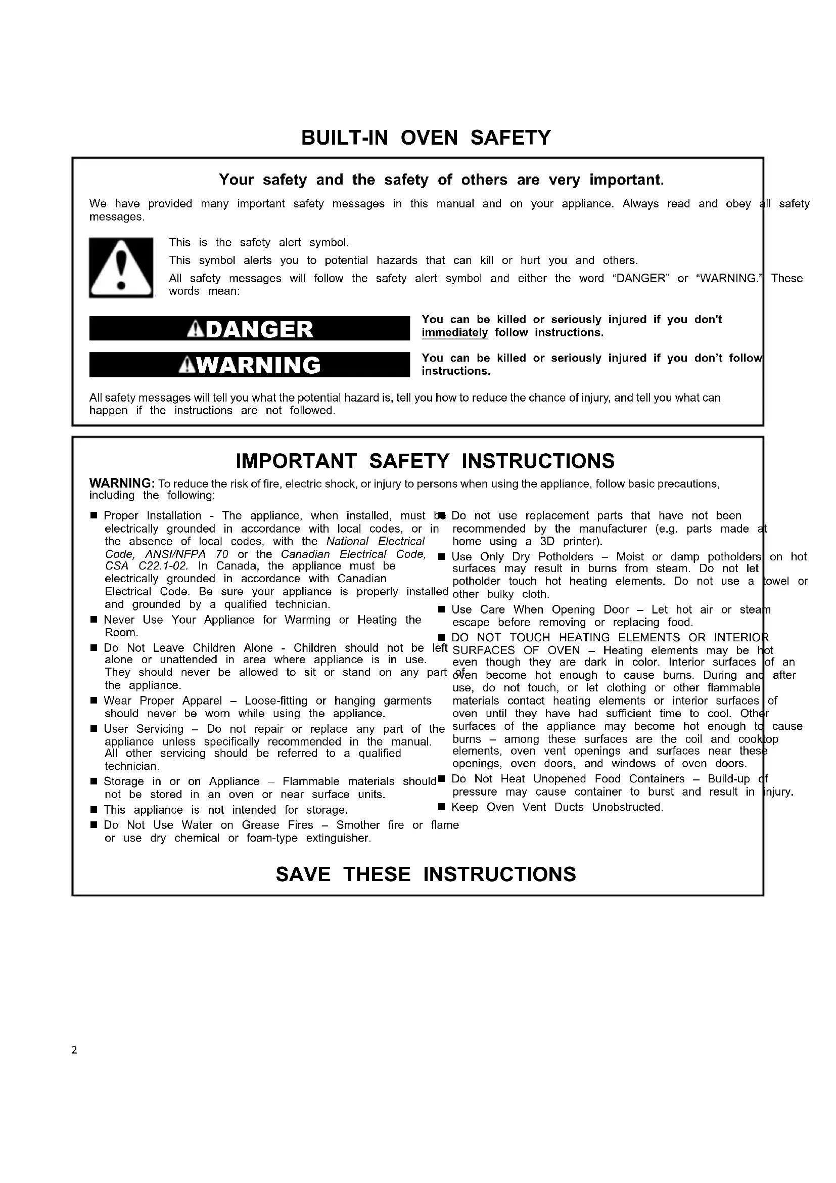 WARNING: To reduce the risk of fire, electric shock, or injury to persons when using the appliance, follow basic precautions, including the following: Proper Installation - The appliance, when installed, must be electrically grounded in accordance with local codes, or in the absence of local codes, with the National Electrical Code, ANSI/NFPA 70 or the Canadian Electrical Code, CSA C22.1-02. In Canada, the appliance must be electrically grounded in accordance with Canadian Electrical Code. Be sure your appliance is properly installed and grounded by a qualified technician. Never Use Your Appliance for Warming or Heating the Room. Do Not Leave Children Alone - Children should not be left alone or unattended in area where appliance is in use. They should never be allowed to sit or stand on any part of the appliance. Wear Proper Apparel – Loose-fitting or hanging garments should never be worn while using the appliance. User Servicing – Do not repair or replace any part of the appliance unless specifically recommended in the manual. All other servicing should be referred to a qualified technician. Storage in or on Appliance – Flammable materials should not be stored in an oven or near surface units. This appliance is not intended for storage. Do Not Use Water on Grease Fires – Smother fire or flame or use dry chemical or foam-type extinguisher. Do not use replacement parts that have not been recommended by the manufacturer (e.g. parts made at home using a 3D printer). Use Only Dry Potholders – Moist or damp potholders on hot surfaces may result in burns from steam. Do not let potholder touch hot heating elements. Do not use a towel or other bulky cloth. Use Care When Opening Door – Let hot air or steam escape before removing or replacing food. DO NOT TOUCH HEATING ELEMENTS OR INTERIOR SURFACES OF OVEN – Heating elements may be hot even though they are dark in color. Interior surfaces of an oven become hot enough to cause burns. During and after use, do not touch, or let clothing or other flammable materials contact heating elements or interior surfaces of oven until they have had sufficient time to cool. Other surfaces of the appliance may become hot enough to cause burns – among these surfaces are the coil and cooktop elements, oven vent openings and surfaces near these openings, oven doors, and windows of oven doors. Do Not Heat Unopened Food Containers – Build-up of pressure may cause container to burst and result in injury. Keep Oven Vent Ducts Unobstructed.