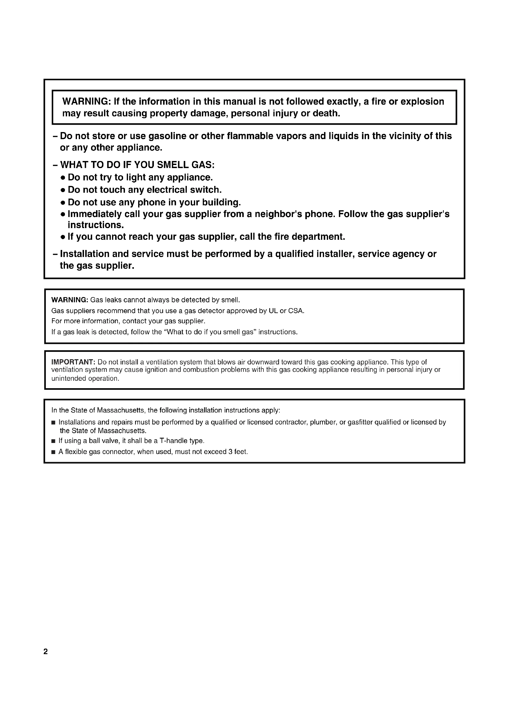 may result causing property damage, personal injury or death. – Do not store or use gasoline or other flammable vapors and liquids in the vicinity of this or any other appliance. – WHAT TO DO IF YOU SMELL GAS: