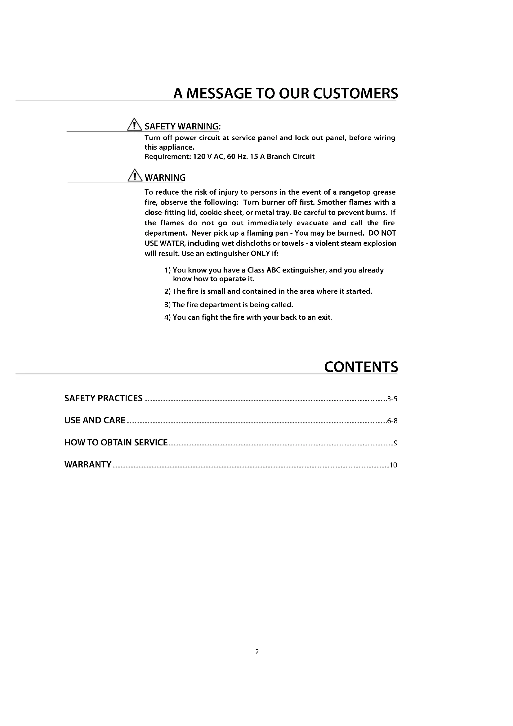 SAFETY WARNING: Turn off power circuit at service panel and lock out panel, before wiring this appliance. Requirement: 120 V AC, 60 Hz. 15 A Branch Circuit WARNING To reduce the risk of injury to persons in the event of a rangetop grease fire, observe the following: Turn burner off first. Smother flames with a close-fitting lid, cookie sheet, or metal tray. Be careful to prevent burns. If the flames do not go out immediately evacuate and call the fire department. Never pick up a flaming pan - You may be burned. DO NOT USE WATER, including wet dishcloths or towels - a violent steam explosion will result. Use an extinguisher ONLY if: