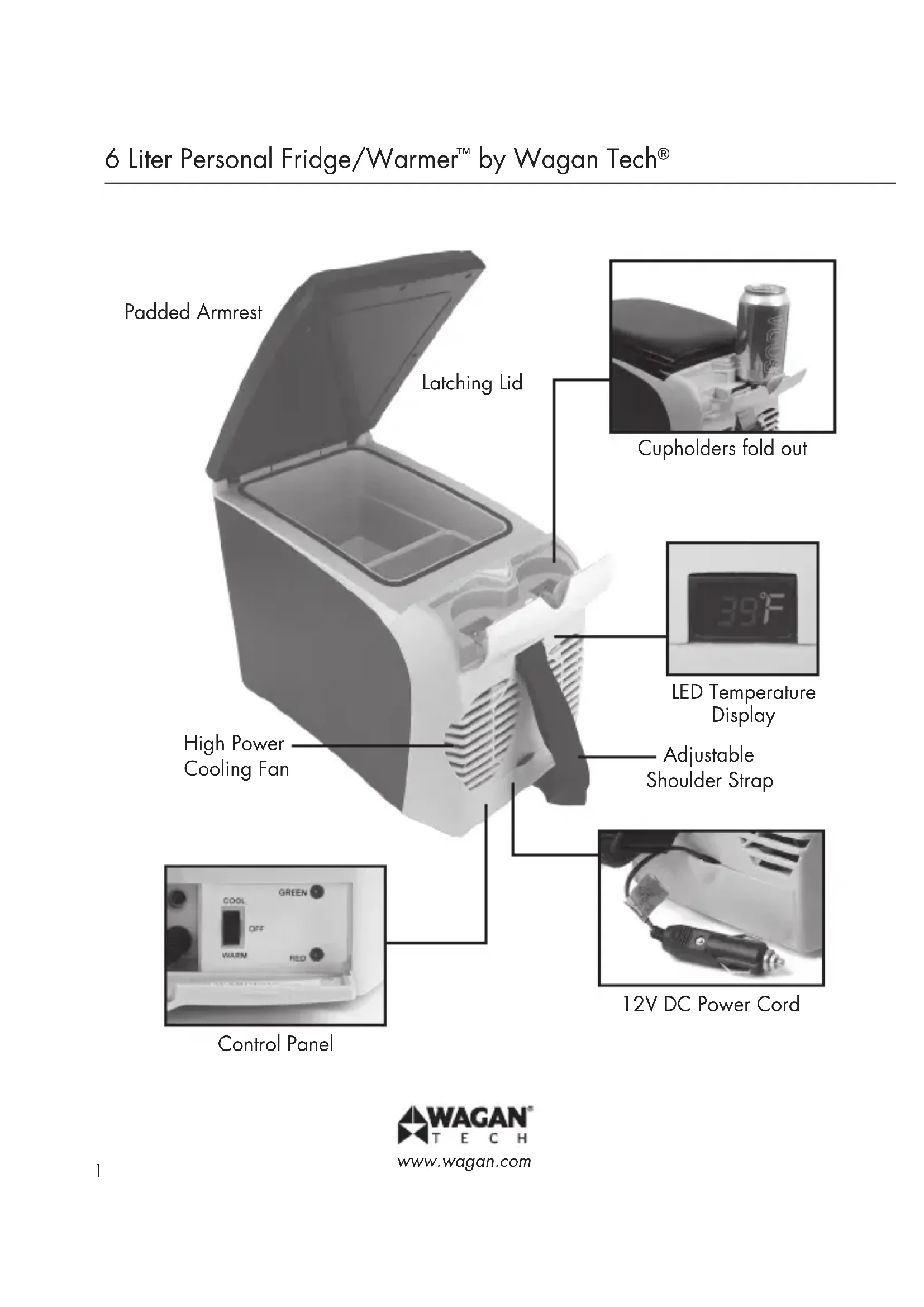 www.wagan.com Cupholders fold out Latching Lid LED Temperature Display Adjustable Shoulder Strap 12V DC Power Cord Control Panel High Power Cooling Fan Padded Armrest©2014 Wagan Corporation. All Rights Reserved. Wagan Tech and wagan.com are trademarks used by Wagan Corporation. User’s Manual—Read before using this equipment