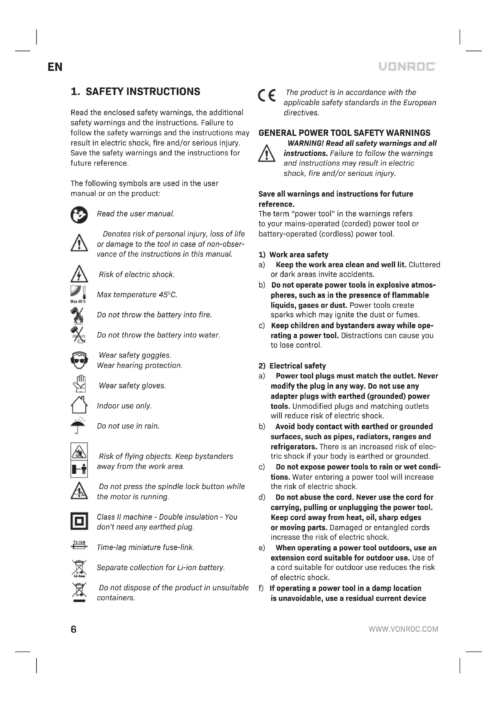 move very persistent dirt using a soft cloth moiste- ned with soapsuds. Do not use any solvents such as gasoline, alcohol, ammonia, etc. Chemicals such as these will damage the synthetic components. ENVIRONMENT Faulty and/or discarded electrical or electronic apparatus have to be collected at the appropriate recycling locations. Only for EC countries Do not dispose of power tools into domestic waste. According to the European Guideline 2012/19/EC for Waste Electrical and Electronic Equipment and its implementation into national right, power tools that are no longer usable must be collected separately and disposed of in an environmentally friendly way. WARRANTY VONROC products are developed to the highest quality standards and are guaranteed free of defects in both materials and workmanship for the period lawfully stipulated starting from the date of original purchase. Should the product develop any failure during this period due to defective material and/or workmanship then contact VONROC directly. The following circumstances are excluded from this guarantee: