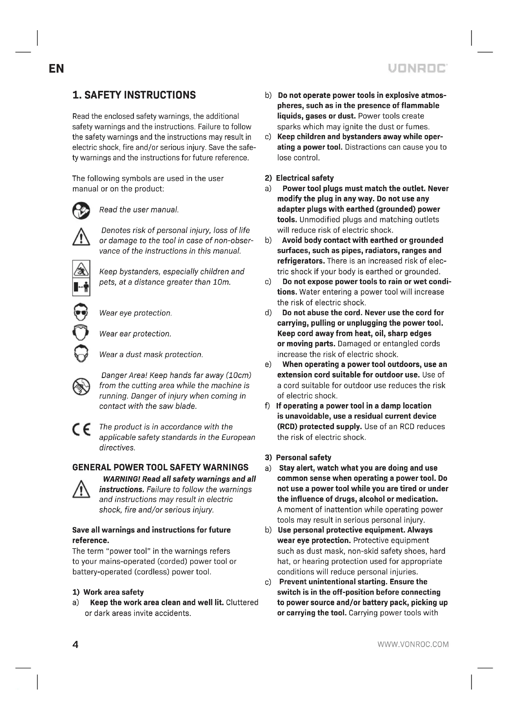 Download the instructions for your Saw in PDF format for free! Find your manual RS502AC - Vonroc and take your electronic device back in hand. On this page are published all the documents necessary for the use of your device. RS502AC by Vonroc.