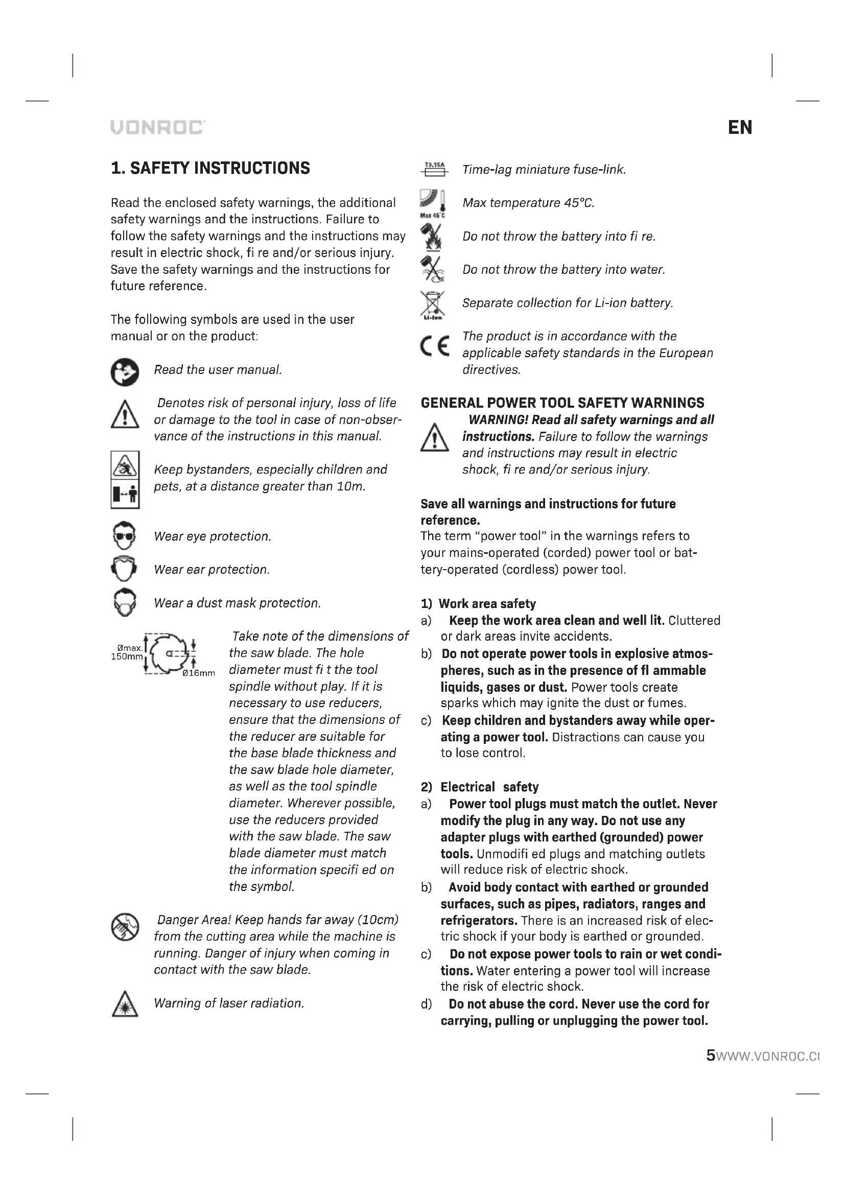 The following symbols are used in the user manual or on the product: Read the user manual. Denotes risk of personal injury, loss of life or damage to the tool in case of non-obser- vance of the instructions in this manual. Keep bystanders, especially children and pets, at a distance greater than 10m. Wear eye protection. Wear ear protection. Wear a dust mask protection. Ø16mmØmax.150mm Take note of the dimensions of the saw blade. The hole diameter must fi t the tool spindle without play. If it is necessary to use reducers, ensure that the dimensions of the reducer are suitable for the base blade thickness and the saw blade hole diameter, as well as the tool spindle diameter. Wherever possible, use the reducers provided with the saw blade. The saw blade diameter must match the information specifi ed on the symbol. Danger Area! Keep hands far away (10cm) from the cutting area while the machine is running. Danger of injury when coming in contact with the saw blade. Warning of laser radiation. Time-lag miniature fuse-link. Max temperature 45°C. Do not throw the battery into fi re. Do not throw the battery into water. Separate collection for Li-ion battery. The product is in accordance with the applicable safety standards in the European directives.