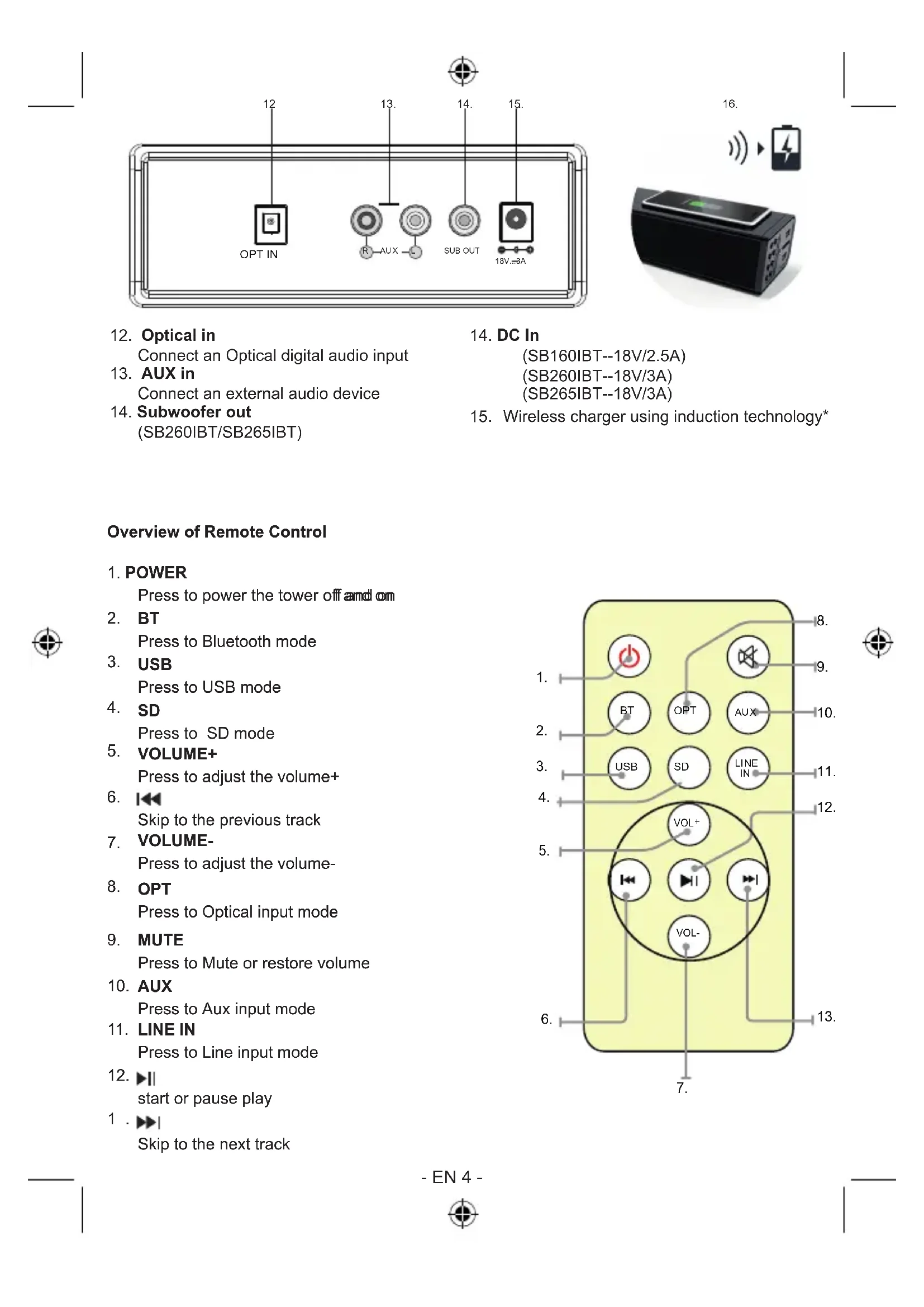 Mute Press to Mute or restore volume14. DC In (SB160IBT--18V/2.5A) (SB260IBT--18V/3A) (SB265IBT--18V/3A)