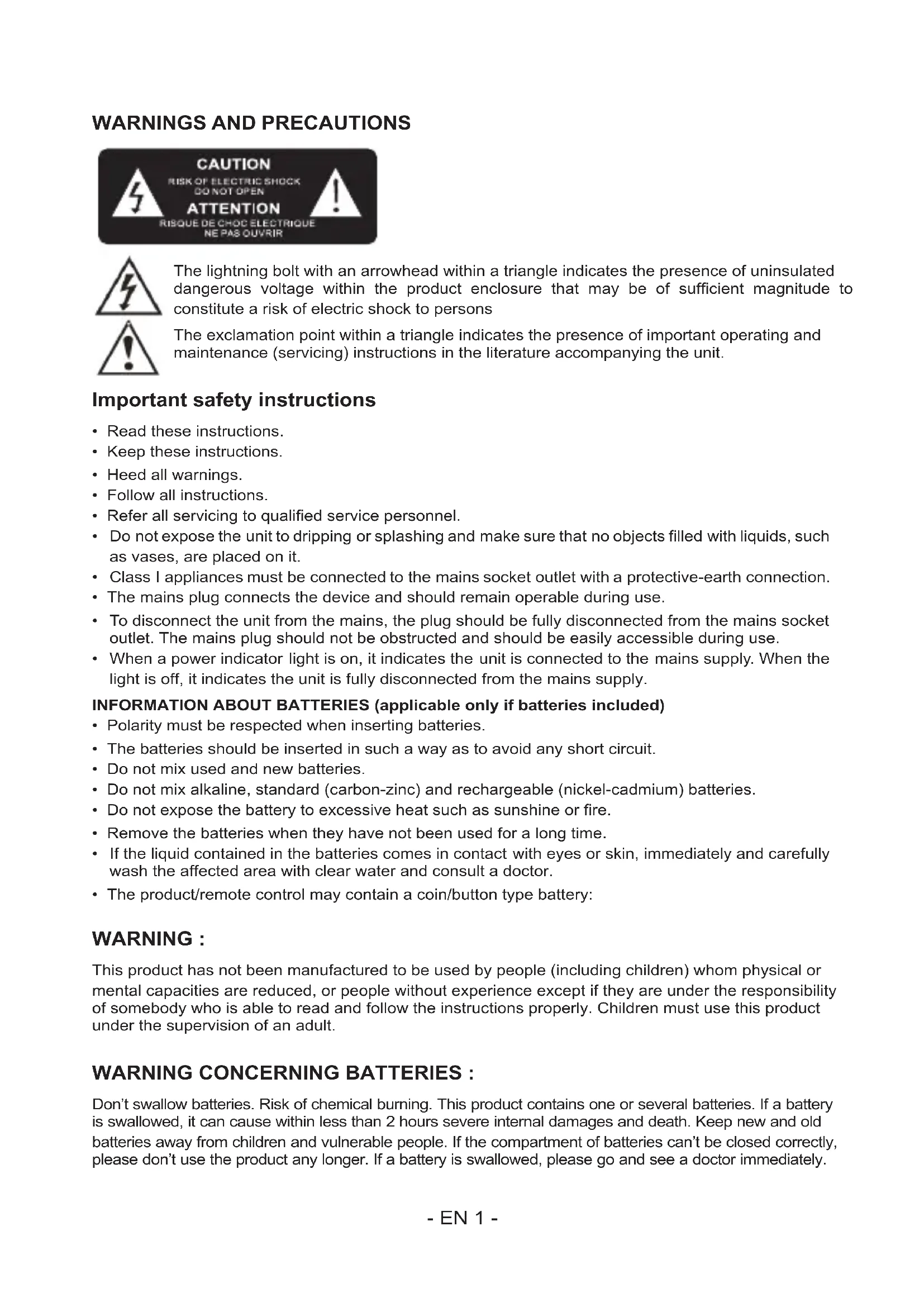 This product has not been manufactured to be used by people (including children) whom physical or mental capacities are reduced, or people without experience except if they are under the responsibility of somebody who is able to read and follow the instructions properly. Children must use this product under the supervision of an adult. WARNING CONCERNING BATTERIES : Don’t swallow batteries. Risk of chemical burning. This product contains one or several batteries. If a battery is swallowed, it can cause within less than 2 hours severe internal damages and death. Keep new and old batteries away from children and vulnerable people. If the compartment of batteries can’t be closed correctly, please don’t use the product any longer. If a battery is swallowed, please go and see a doctor immediately.- EN 2 - IMPORTANT REMARKS : Risk of explosion if the battery/ies is/are not replaced correctly or if the product is not used for a long time with batteries left inside. Replace old batteries by an identical or similar models. double insulation direct current alternating current symbol indoor use Care of the environment Your product is designed and manufactured with high quality materials and components, which can be recycled and reused. When this crossed-out wheeled bin symbol is attached to a product it means that the product is covered by the European Directive 2002/96/EC. Please inform yourself about the local separate collection system for electrical and electronic products. Please act according to your local rules and do not dispose of your old products with your normal household waste. Correct disposal of your old product helps to prevent potential negative consequences for the environment and human health. Compliance This product complies with the radio interference requirements of the Europe Community. Battery power