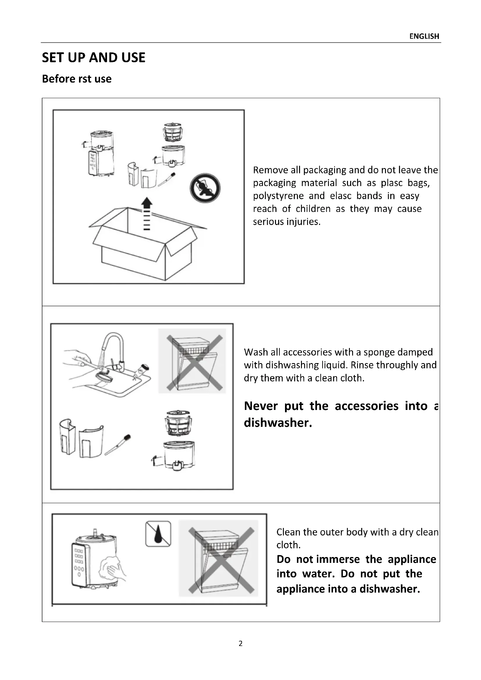 operation. Never put the motor unit into the dishwashing or under the water. Cleaning the body motor unit: Clean the outer surface with a soft cloth (or sponge) on the surfaces of the appliance.ENGLISH