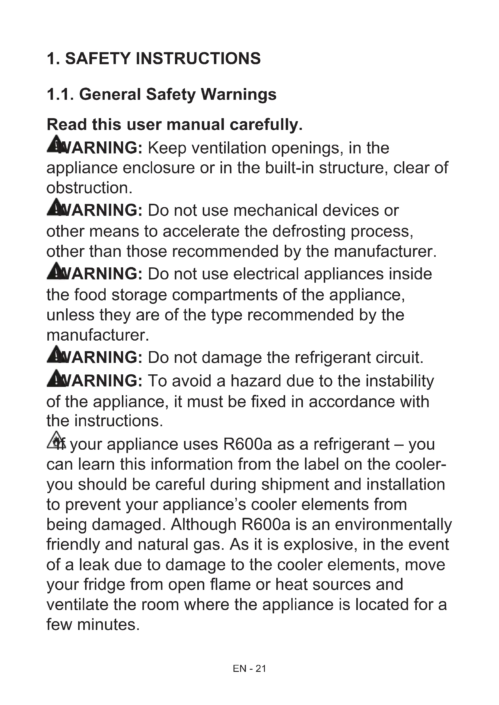 of the appliance, it must be xed in accordance with the instructions. If your appliance uses R600a as a refrigerant – you can learn this information from the label on the cooler- you should be careful during shipment and installation to prevent your appliance’s cooler elements from being damaged. Although R600a is an environmentally friendly and natural gas. As it is explosive, in the event of a leak due to damage to the cooler elements, move your fridge from open ame or heat sources and ventilate the room where the appliance is located for a few minutes.EN - 22