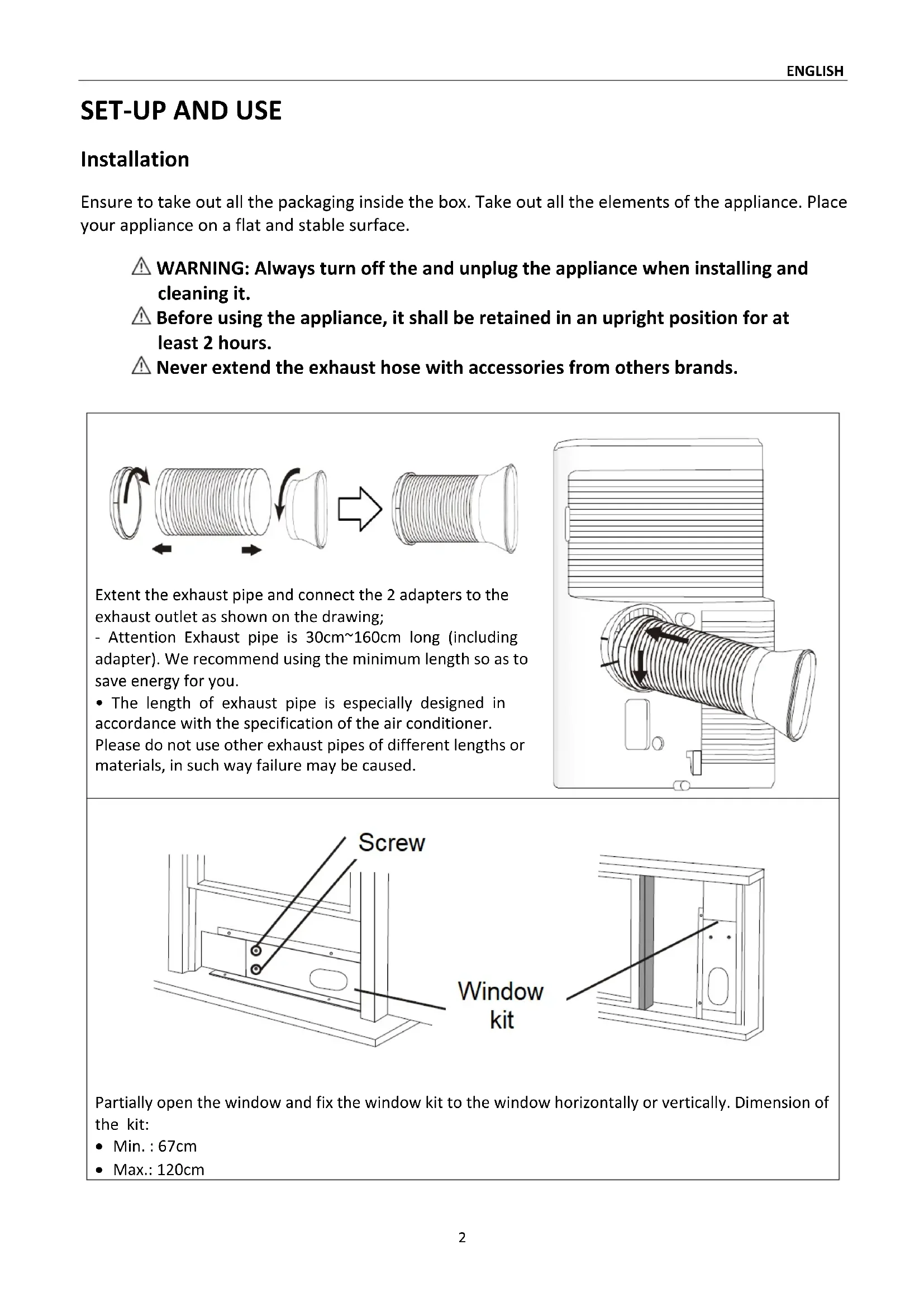 Extent the exhaust pipe and connect the 2 adapters to the exhaust outlet as shown on the drawing; - Attention Exhaust pipe is 30cm~160cm long (including adapter). We recommend using the minimum length so as to save energy for you.