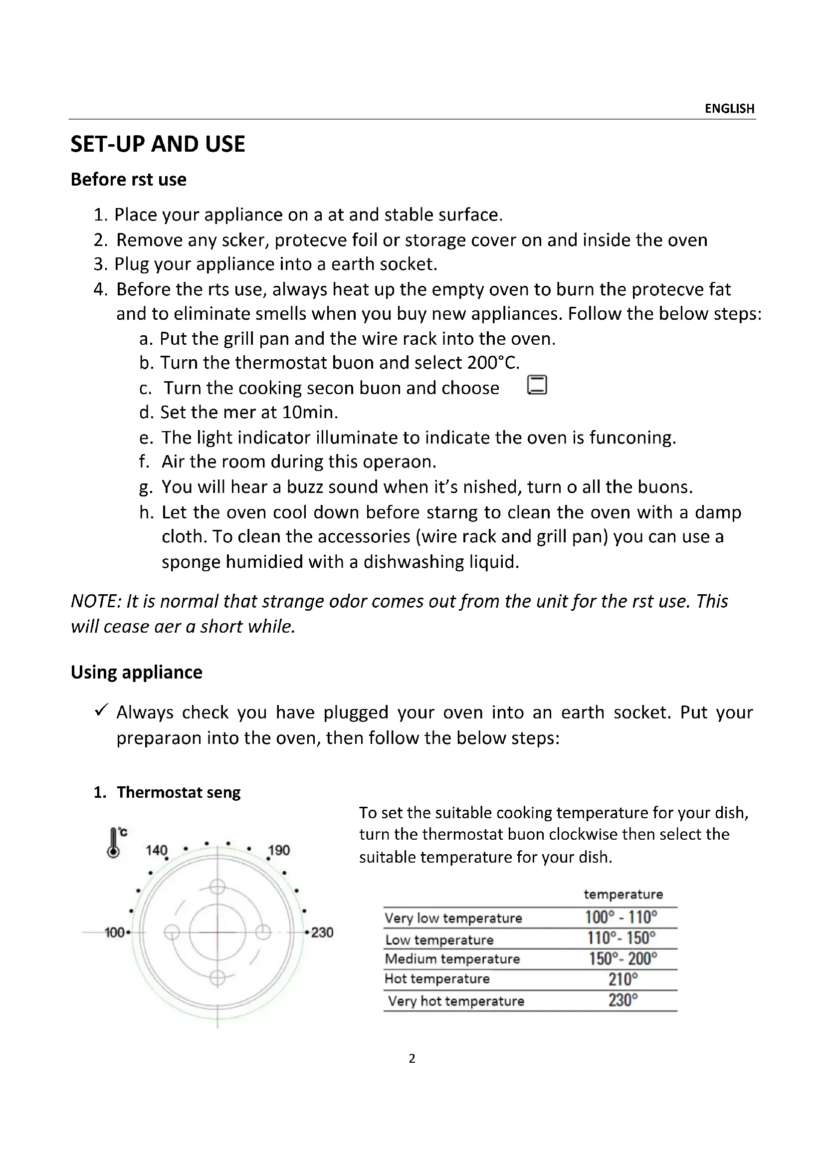 and to eliminate smells when you buy new appliances. Follow the below steps: a. Put the grill pan and the wire rack into the oven. b. Turn the thermostat button and select 200°C. c. Turn the cooking section button and choose . d. Set the timer at 10min. e. The light indicator illuminate to indicate the oven is functioning. f. Air the room during this operation. g. You will hear a buzz sound when it’s finished, turn off all the buttons. h. Let the oven cool down before starting to clean the oven with a damp cloth. To clean the accessories (wire rack and grill pan) you can use a sponge humidified with a dishwashing liquid. NOTE: It is normal that strange odor comes out from the unit for the first use. This will cease after a short while. Using appliance Always check you have plugged your oven into an earth socket. Put your preparation into the oven, then follow the below steps: