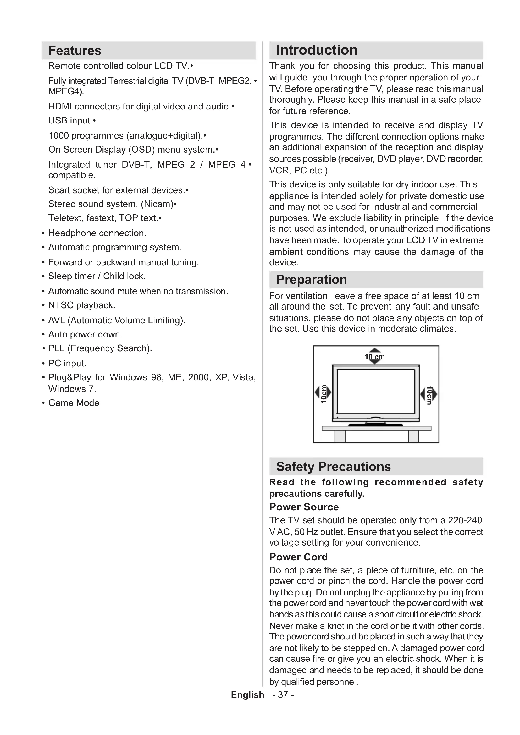PIP SUBTITLE Remote Control LCD TV Instruction Book Note: You should check the contents after opening your purchase and make sure that every item is included. TRADEMARK ACKNOWLEDGMENT “Dolby” and the double-D symbol are trademarks of Dolby Laboratories. Licence Notication (Optional) Manufactured under license from Dolby Laboratories. Electrical devices not in the hands of children Never let children use electrical devices unsupervised. Children cannot always recognize properly any possible danger. Batteries / accumulators can be life threatening when swallowed. Store batteries out of the reach of small children. In case of swallowing a battery, medical aid has to be sought immediately. Also keep the packaging away from children as there is danger of suffocation. Note:The HDMI connection between PC and TV may cause radio interference in which case it is recommended to use VGA(DSUB-15) connection. The Standby button does not fully switch off this product. Moreover, the device continues to consume power in standby mode. In order to separate the device completely from mains, the mains plug has to be pulled from the mains socket. Because of that the device should be set up in a way, that an unobstructed access to the mains socket is guaranteed, so that in case of emergency the mains plug can be pulled immediately. During periods of prolonged non-use, the TV should be disconnected from the mains power supply.English - 40 - Environmental Information This television is designed to consume less energy to save the environment. • You not only help to save the environment but you can also save money by reducing electricity bills thanks to the energy efciency features of this TV. To reduce energy consumption, you should take the following steps: You can use the Power Save Mode setting, located in the • Other settings menu. If you set the Power Save Mode as On, the TV will switch to energy-saving mode and the luminance level of the TV set will be decreased to optimum level. Note that some picture settings will be unavailable when the TV is in Power Save Mode. When the TV is not in use, please switch off or disconnect the TV from the mains plug. This will also reduce • energy consumption. Note that annually, using the TV set in Power Save Mode has more power efciency than disconnecting • the TV from the mains plug instead of keeping stand-by mode. Therefore it is highly recommended to activate Power Save Mode setting to reduce your annual power consumption. And also it is recommended to disconnect the TV from the mains plug to save energy more when you do not use.